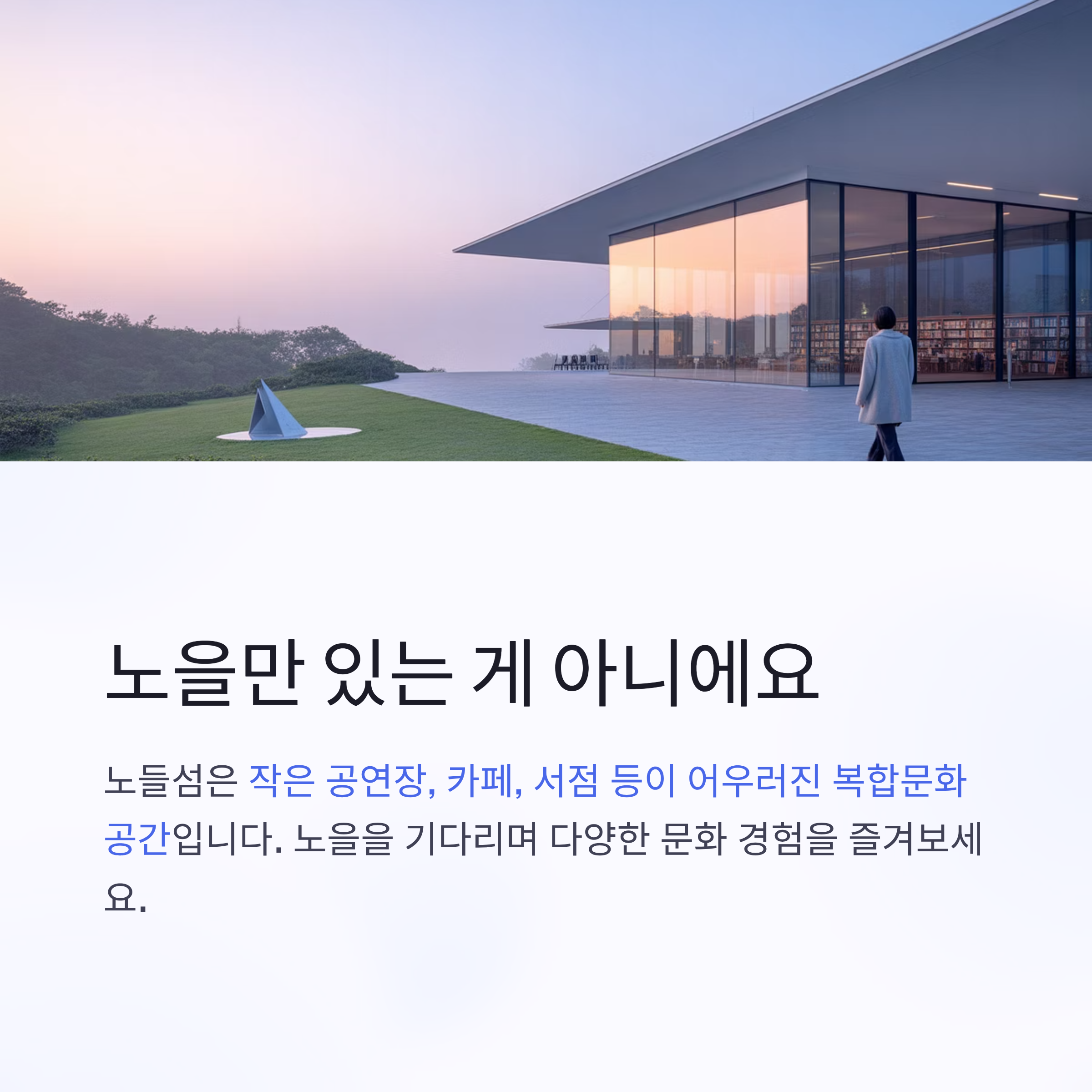 노들섬은 단순한 노을 명소를 넘어 작은 공연장, 카페, 서점 등이 어우러진 복합문화공간입니다. 노을을 기다리는 동안 산책하며 여유를 즐기거나 작은 전시와 공연을 함께 즐길 수도 있습니다.