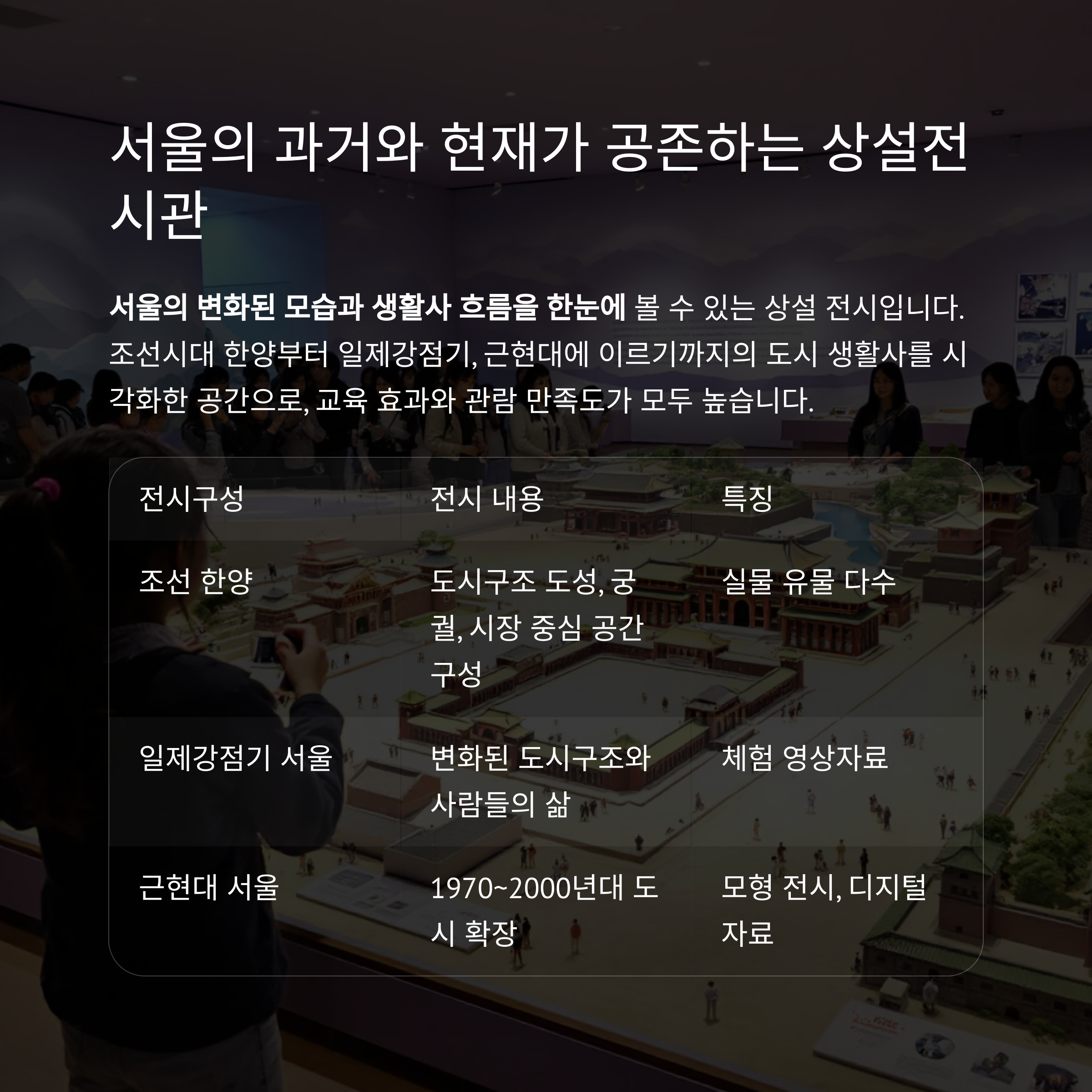 | 근현대 서울 | 1970~2000년대 도시 확장 | 모형 전시, 디지털 자료 |