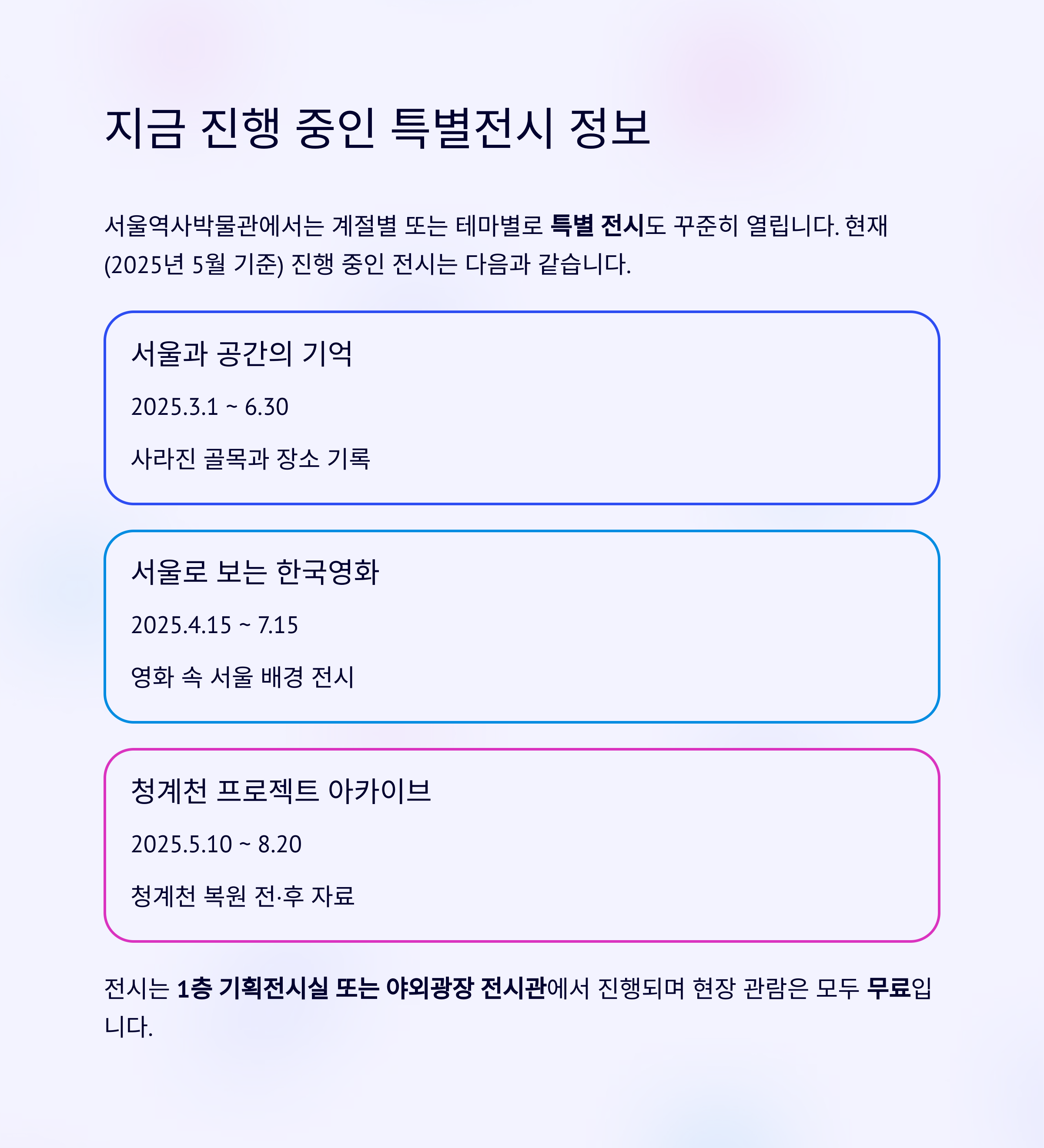 | 청계천 프로젝트 아카이브 | 2025.5.10 ~ 8.20 | 청계천 복원 전·후 자료 |