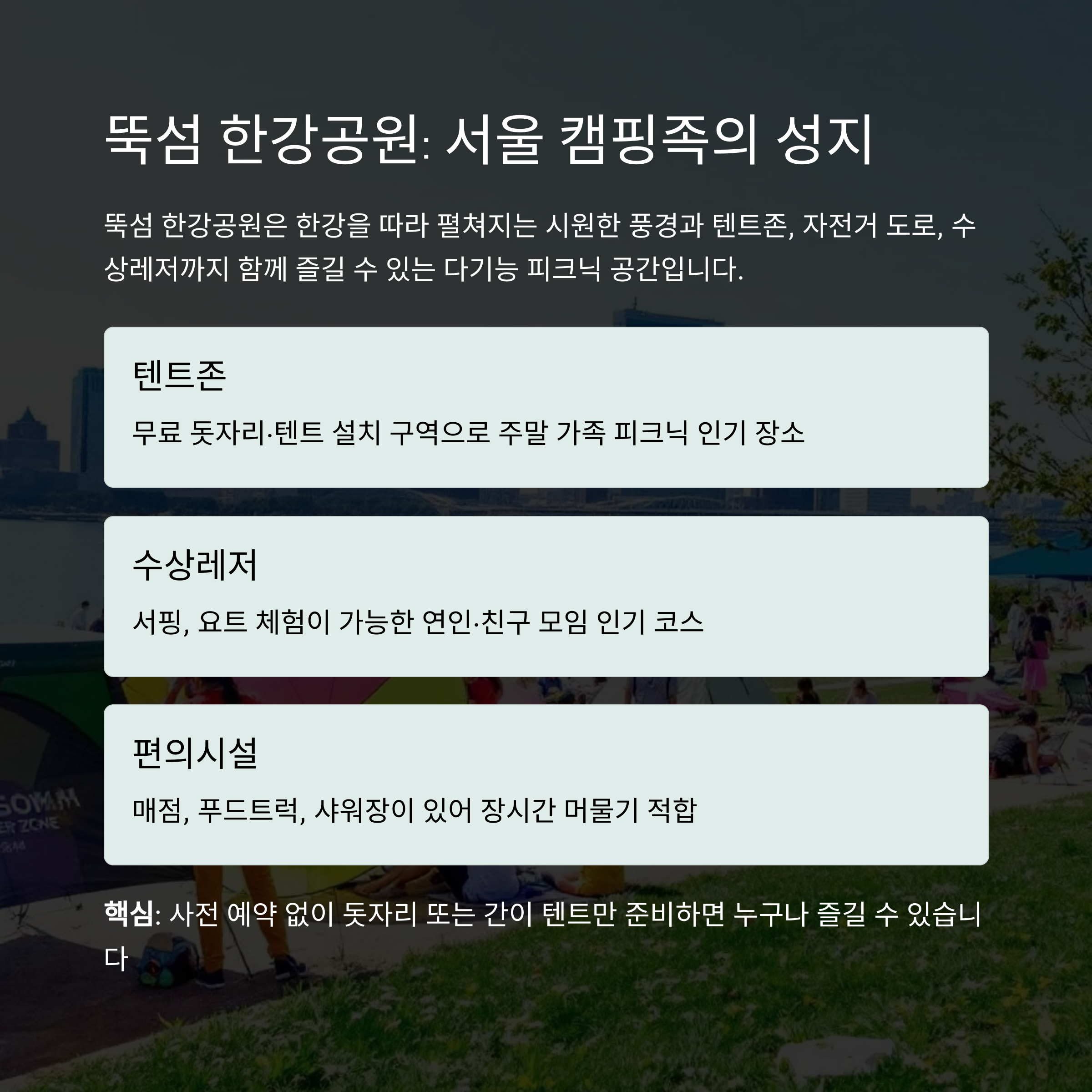 | 뚝섬 텐트존 | 커플, 가족 | 텐트 가능, 한강뷰 |