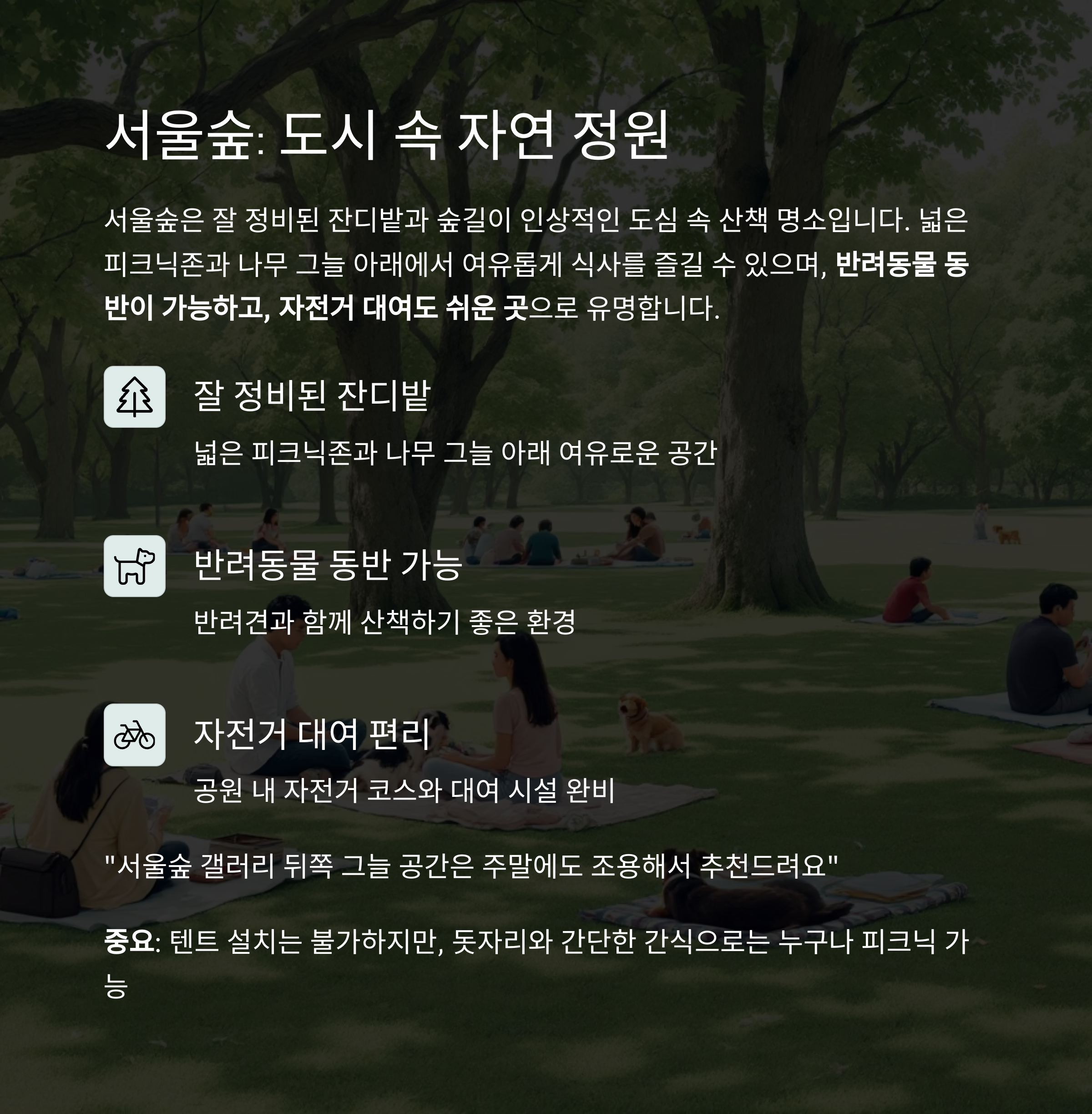 | 서울숲 | 반려인, 감성족 | 그늘 숲길 중심, 산책 최적 |