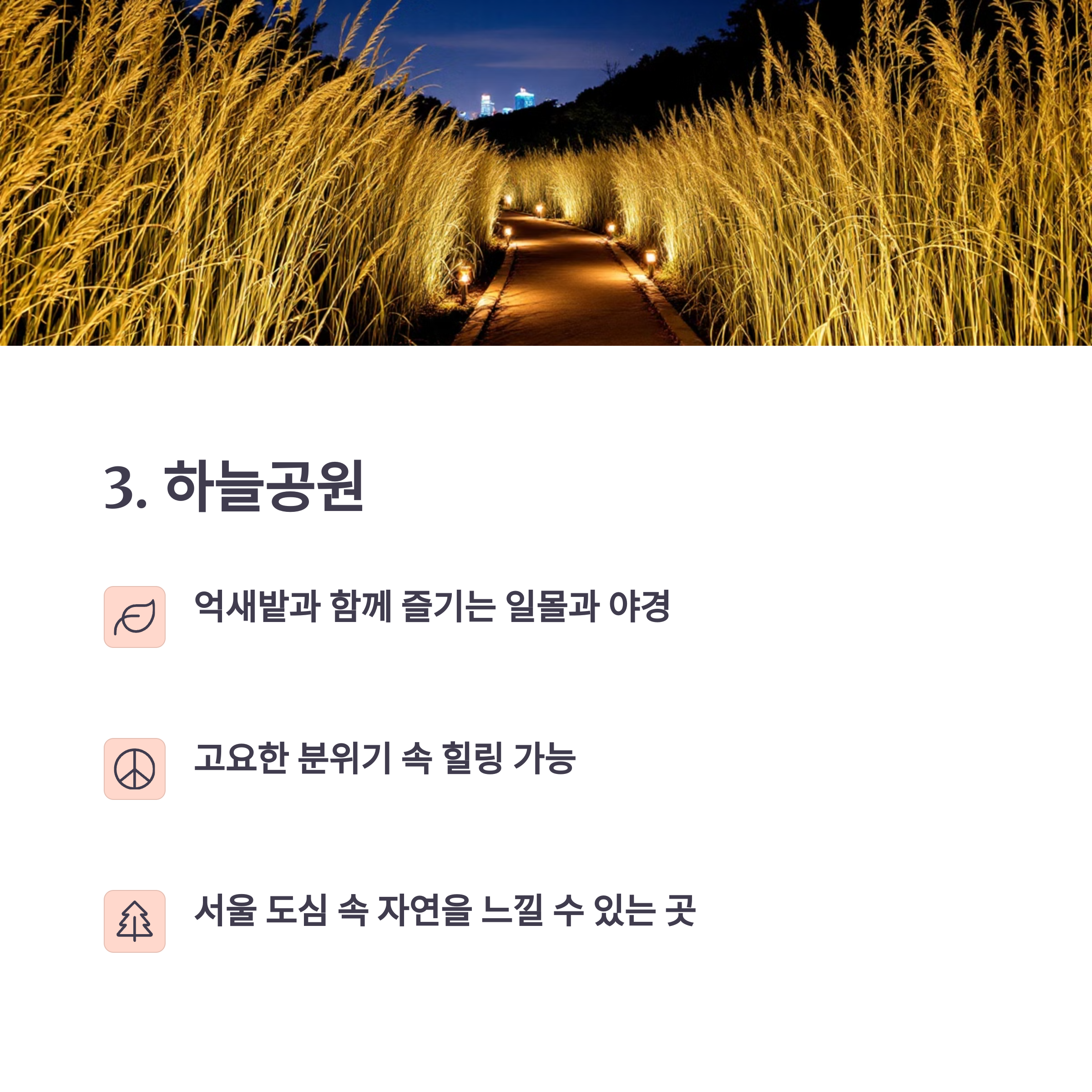 세 번째는 하늘공원입니다. 월드컵공원 내 위치한 이곳은 억새밭이 유명하지만, 일몰과 야경을 동시에 볼 수 있는 포인트로도 유명해요. 서울 외곽까지 탁 트인 전경이 펼쳐지고, 가을 밤엔 바람과 억새의 조화가 아주 낭만적입니다. 낮보다 밤에 더 고요하고 아름다운 분위기를 느낄 수 있어요.