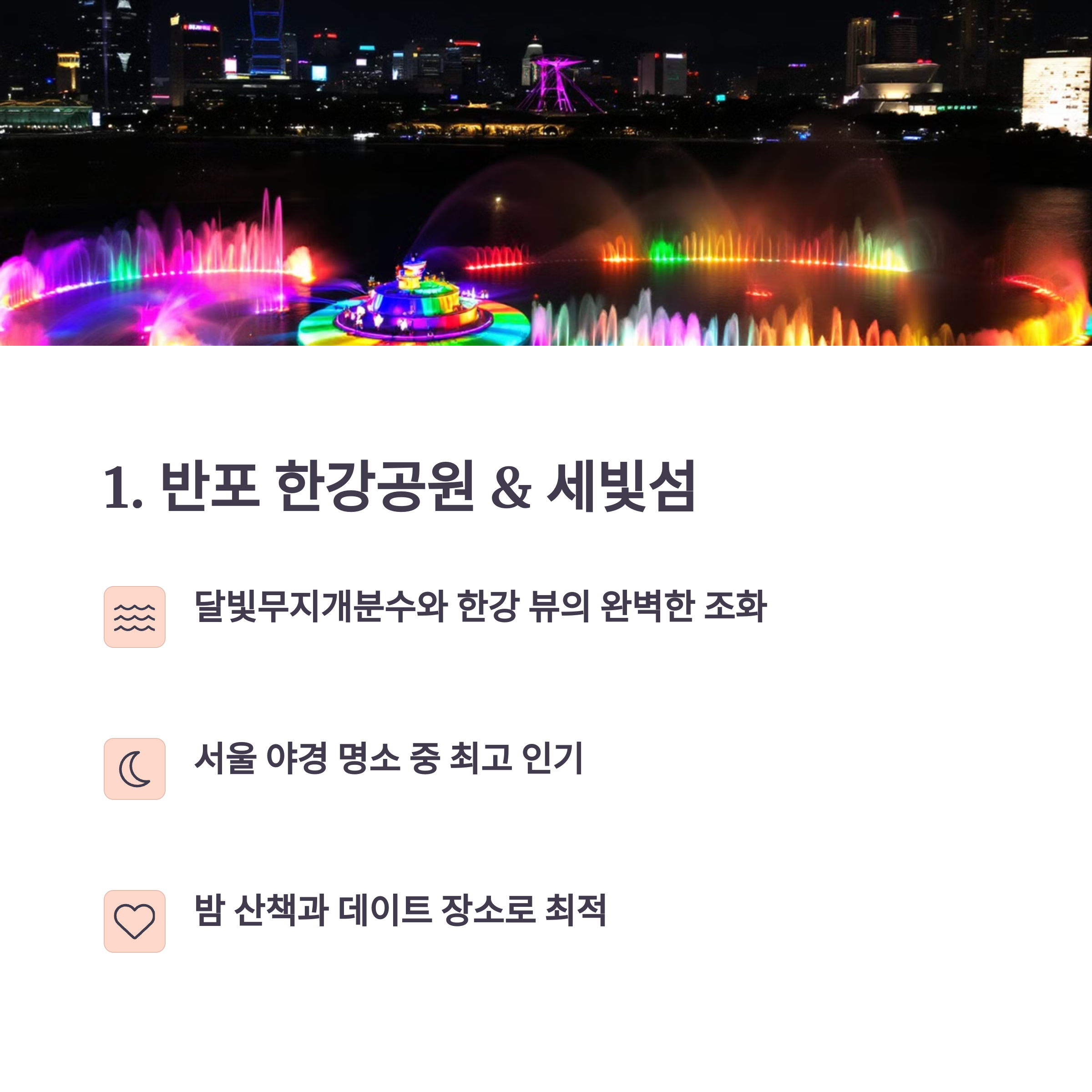 | 야경 + 한강뷰 | 반포 한강공원, 세빛섬, 뚝섬유원지 등 대표적인 강변 명소 |