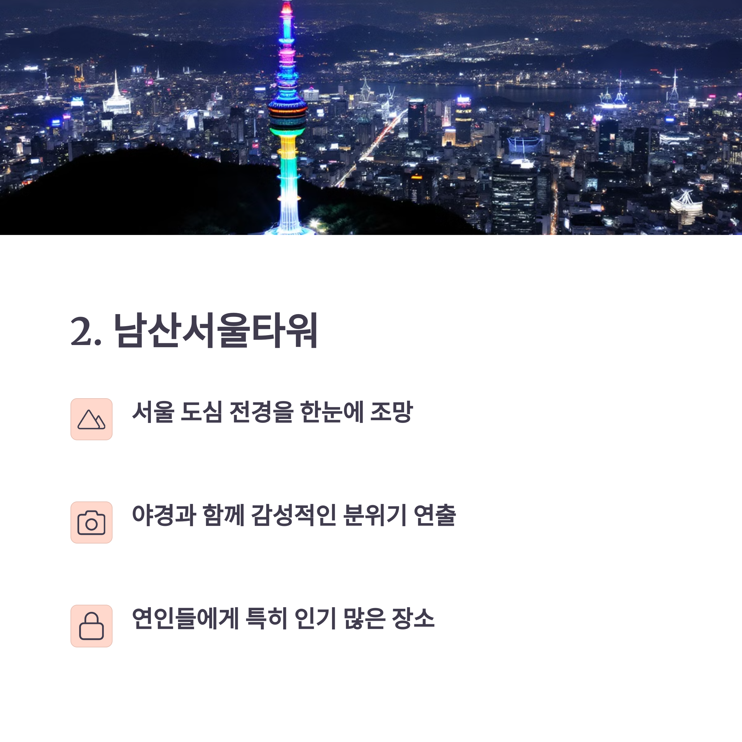 | 전망대 + 도심 뷰 | 남산타워, 하늘공원, 북악스카이웨이 팔각정 등 높은 곳에서 즐기는 서울 |