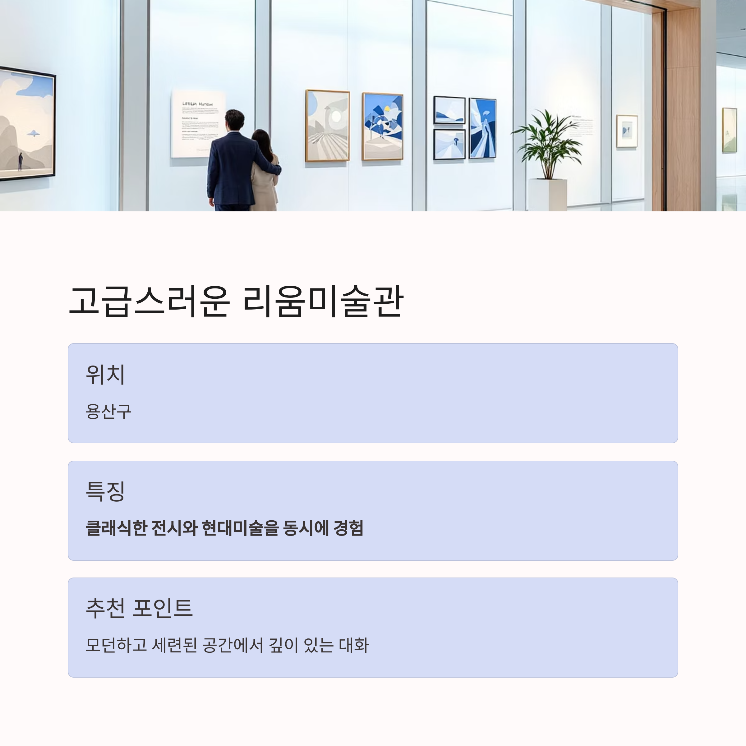 | 리움미술관 | 클래식+현대 예술 전시 | 용산구 | 깊이 있는 대화 유도 |