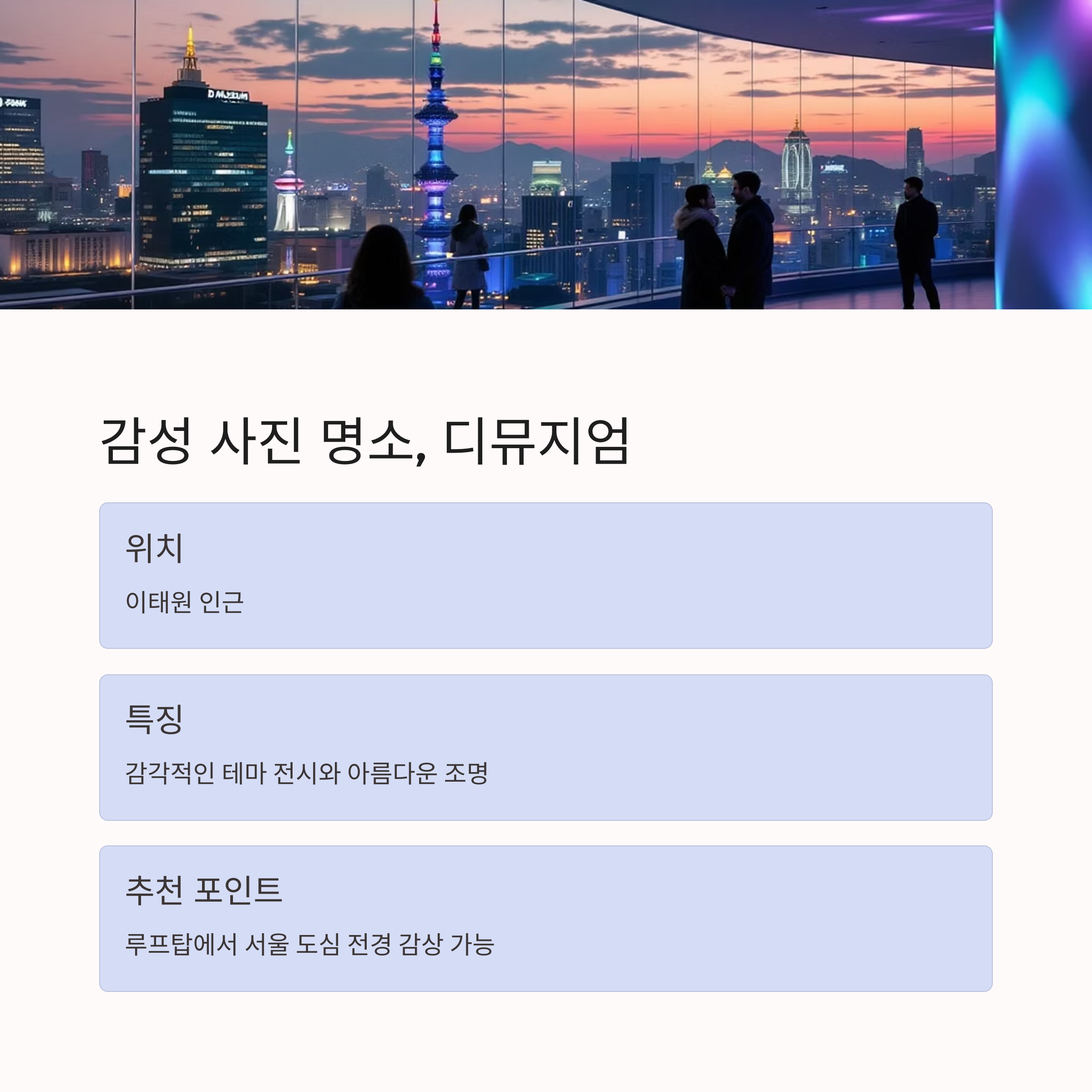 | 디뮤지엄 | 감성적 포토존 전시 | 한남동 | 루프탑 포함 인생샷 명소 |