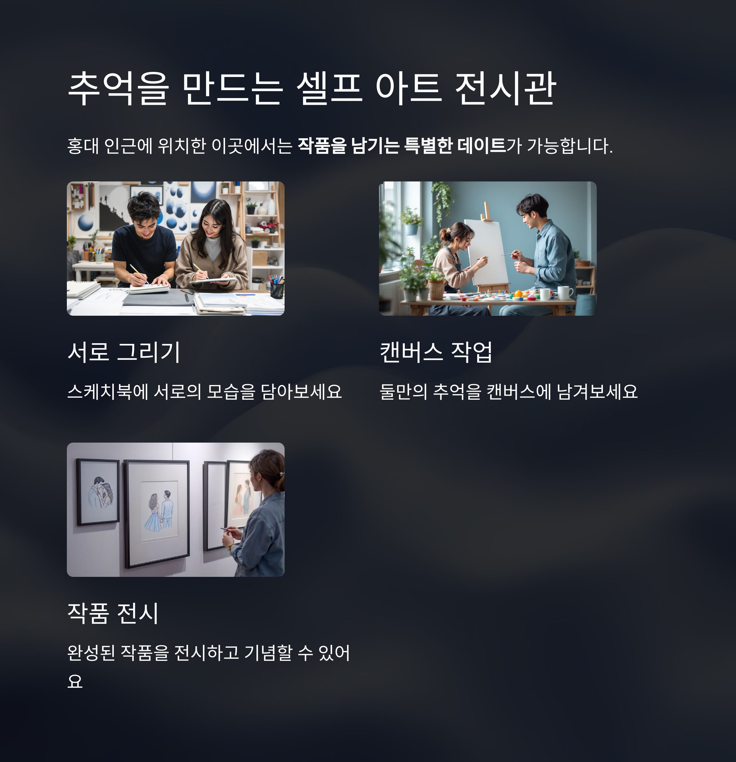 스케치북에 서로를 그려보거나, 캔버스에 추억을 남기는 활동이 가능해 커플만의 작품을 남기는 특별한 데이트가 가능합니다.