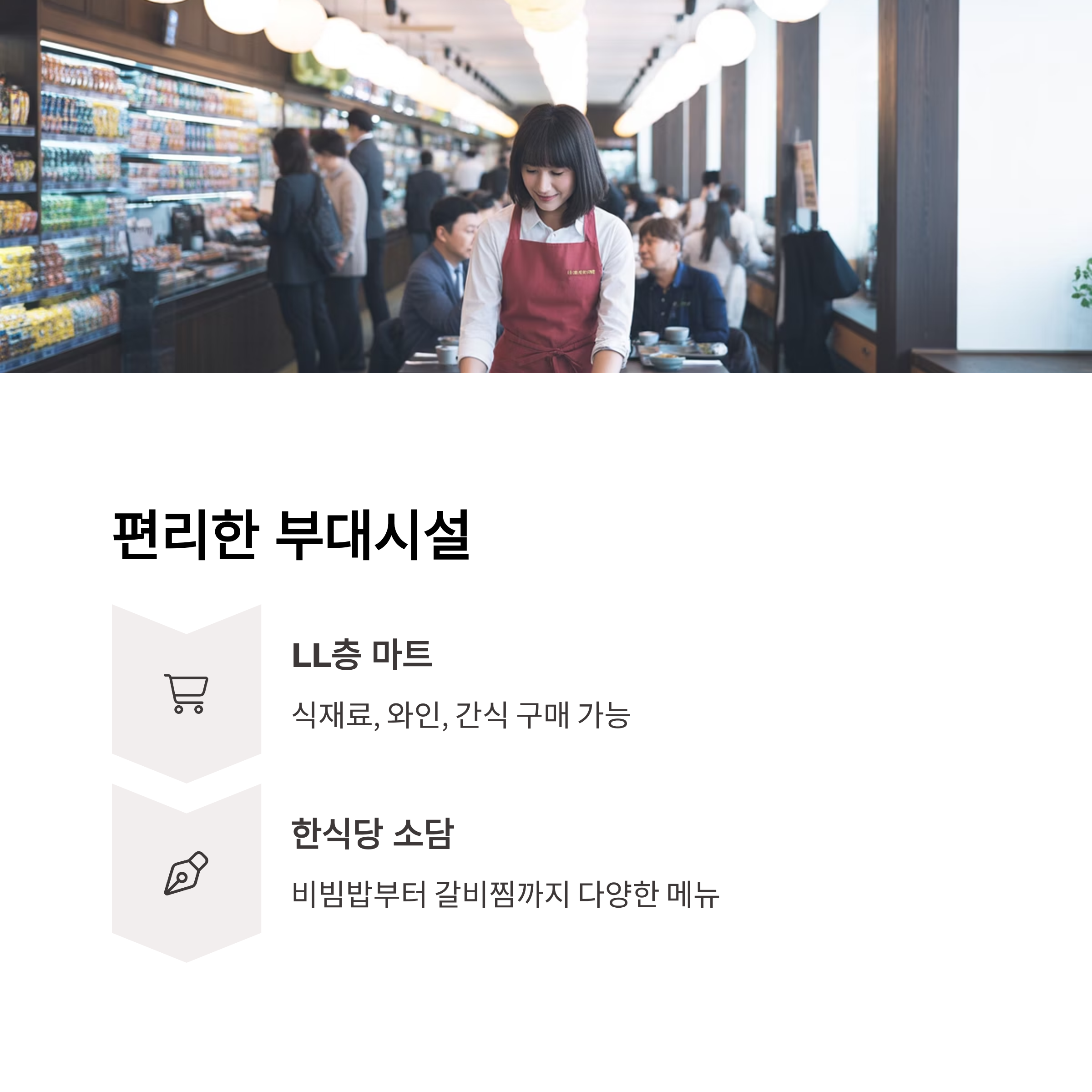LL층 마트에서는 취사 가능 객실 손님을 위한 식재료, 와인, 간단한 간식 등을 구매할 수 있고, 전자레인지도 마련되어 있어 활용도가 높습니다. 한식당 소담에서는 정갈한 비빔밥부터 갈비찜까지 다양한 메뉴를 즐길 수 있습니다.