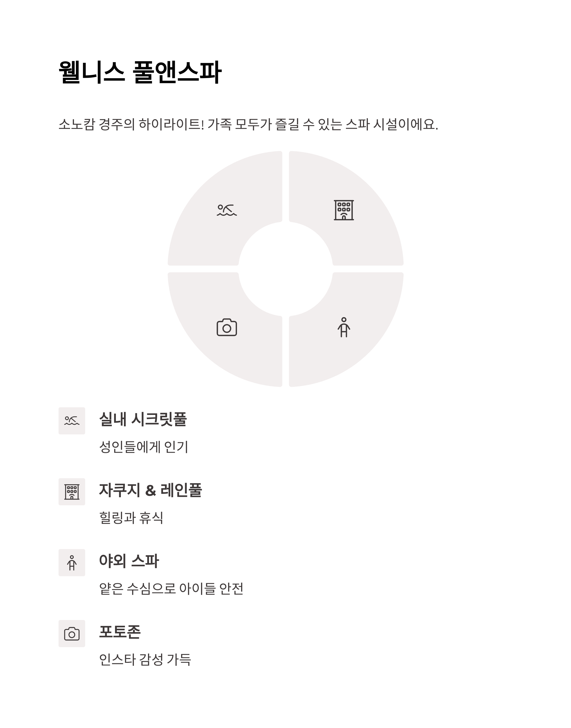 | 스파 | 실내외 풀, 자쿠지, 시크릿풀 | 아이·성인 모두 |