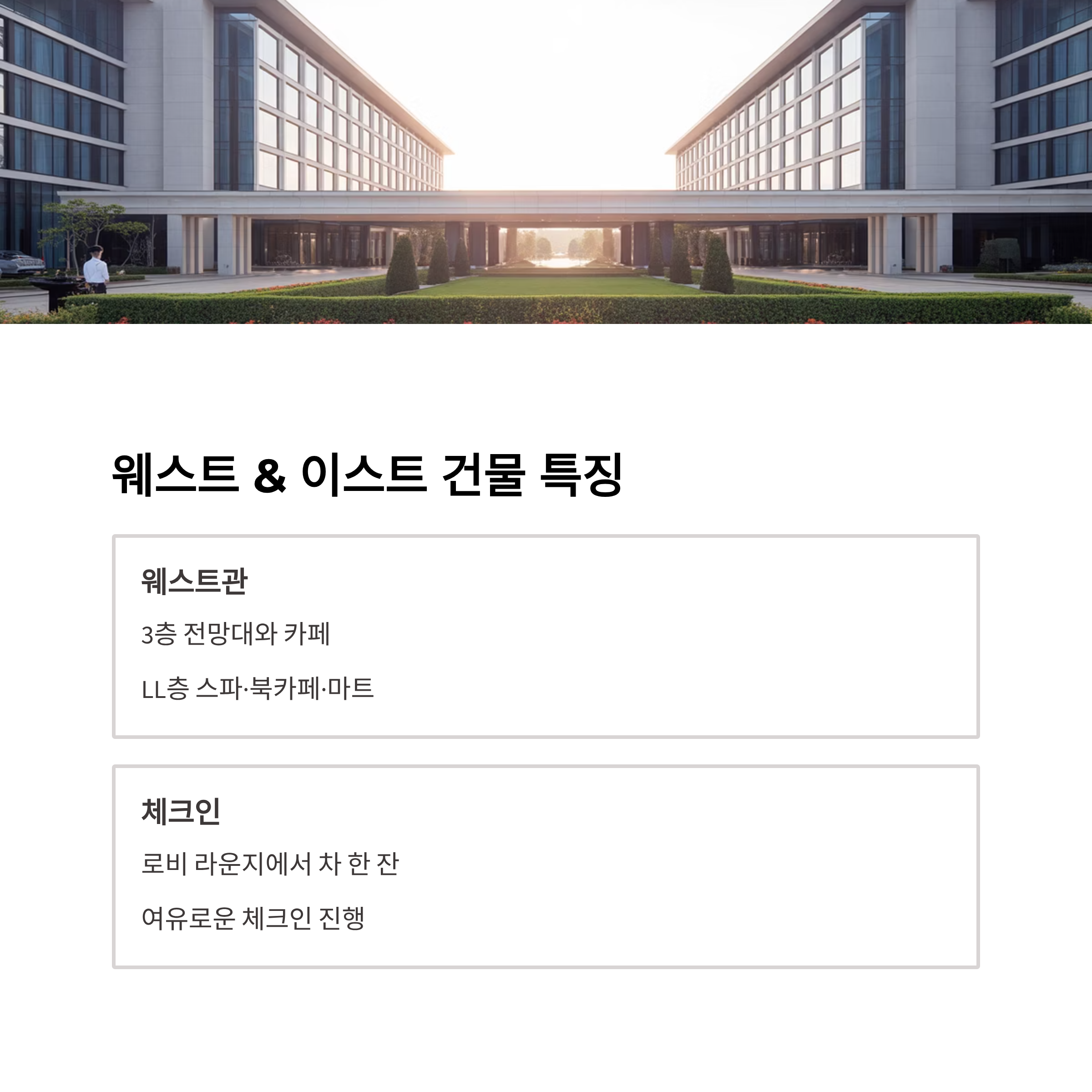 소노캄 경주는 이스트와 웨스트 건물로 나뉘며, 웨스트관은 3층 전망대와 카페, LL층의 스파·북카페·마트가 있어 편리합니다. 체크인은 로비 라운지에서 차 한 잔 하며 여유롭게 진행할 수 있어 만족도가 높습니다.