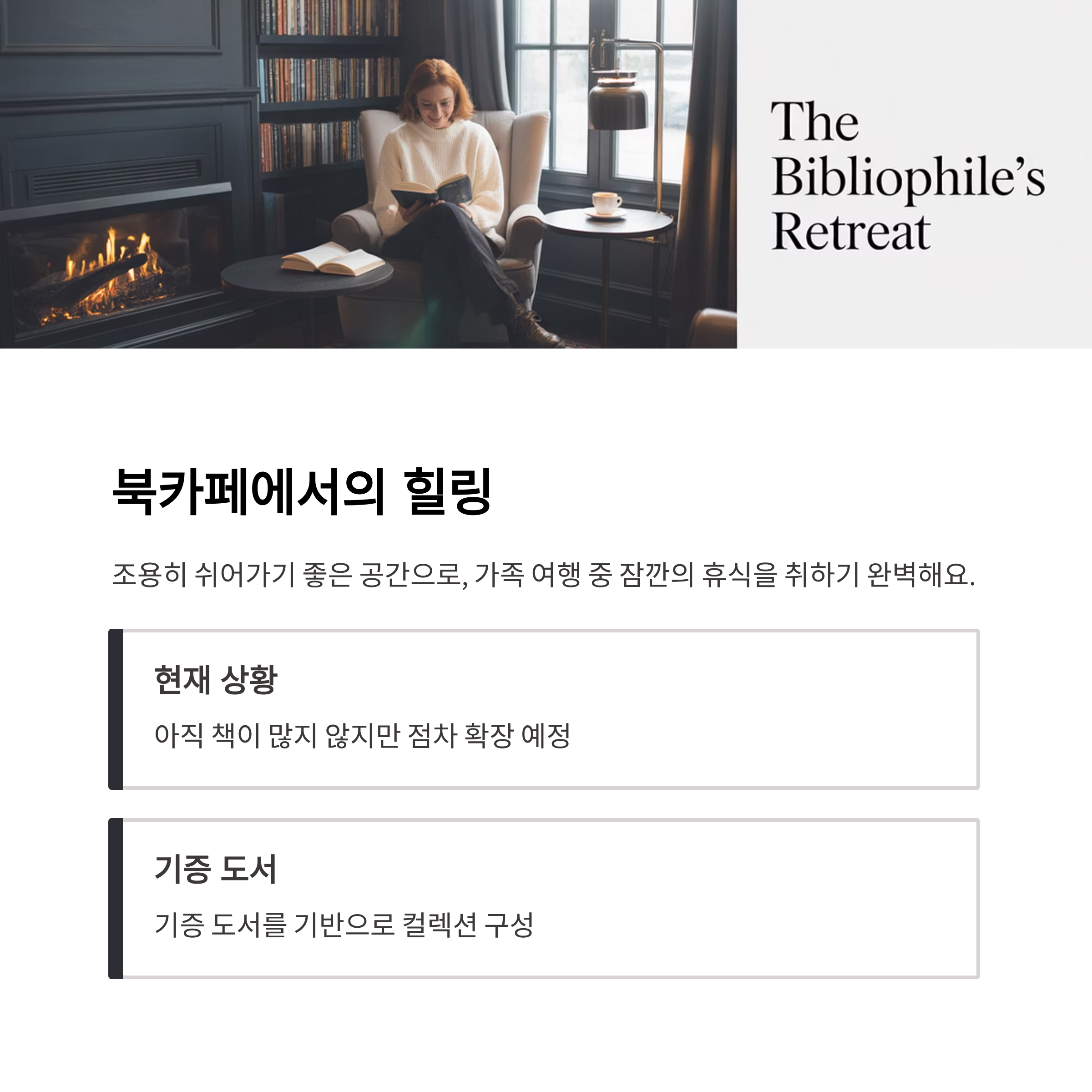 북카페는 아직은 책이 많지 않지만, 기증 도서를 기반으로 점차 확장될 예정이라고 해요. 조용히 쉬어가기 좋은 공간으로, 가족 여행 중 잠깐의 휴식을 취하기 좋습니다.