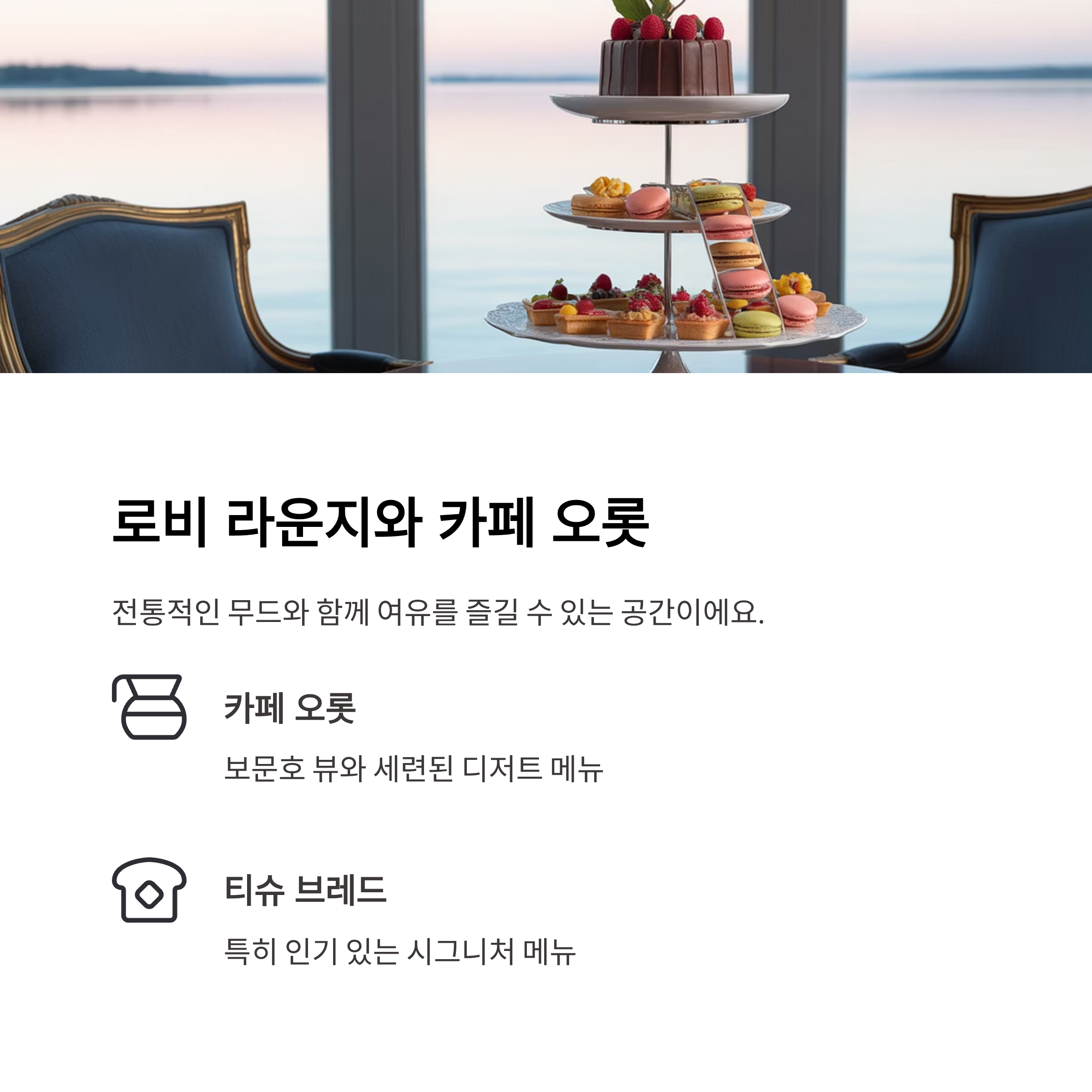 로비 라운지는 전통적인 무드와 함께 여유를 즐길 수 있는 공간이에요. 카페 오롯은 다소 높은 가격대지만 보문호 뷰와 세련된 디저트 메뉴 덕분에 꼭 들려볼 만합니다. 티슈 브레드는 특히 인기 메뉴로 손꼽힙니다.
