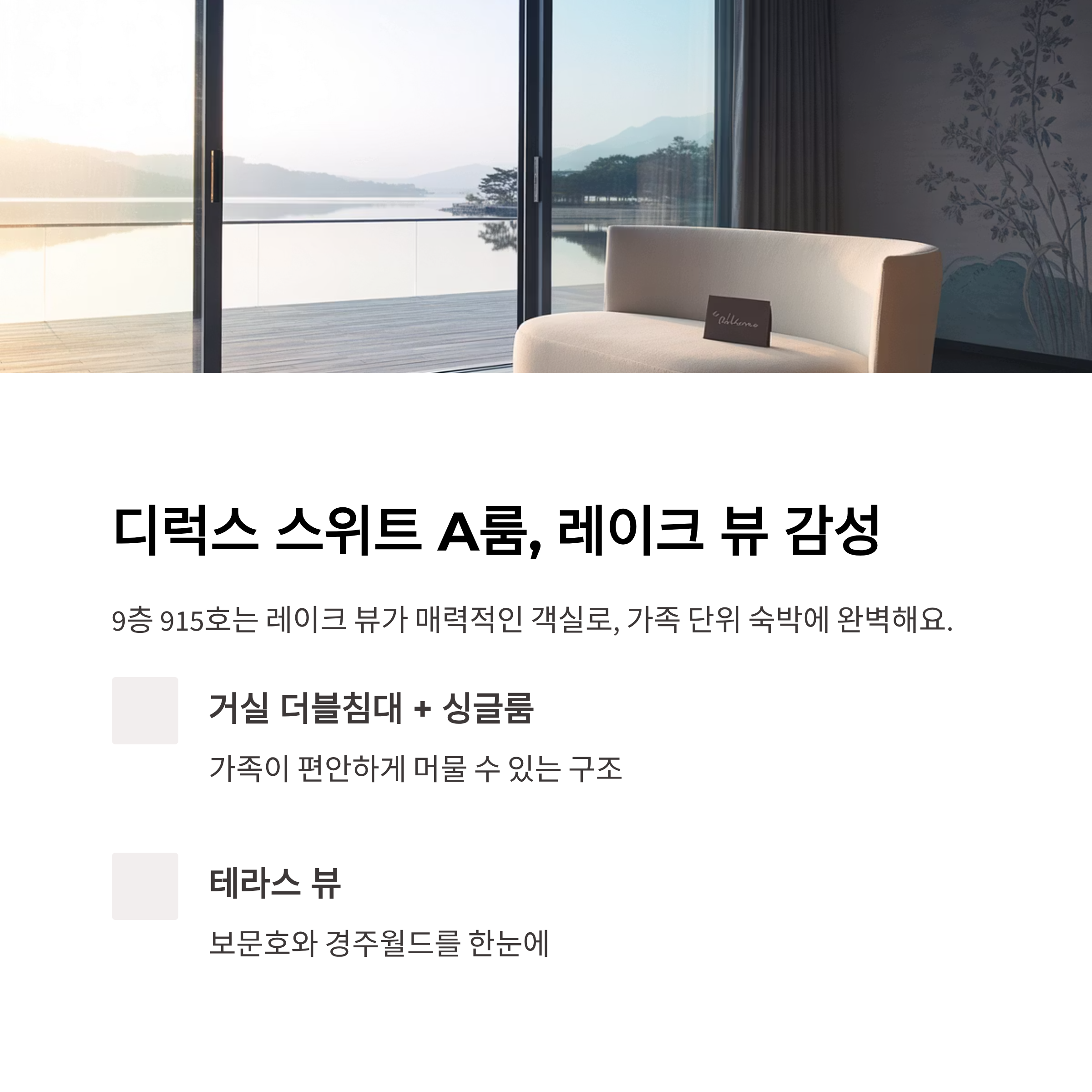 9층 915호는 레이크 뷰가 매력적인 객실로, 거실에 더블침대와 싱글룸이 따로 있어 가족 단위 숙박에 적합합니다. 웰컴키트에는 원두커피와 티가 제공되고, 테라스에서는 보문호와 경주월드를 한눈에 담을 수 있습니다.