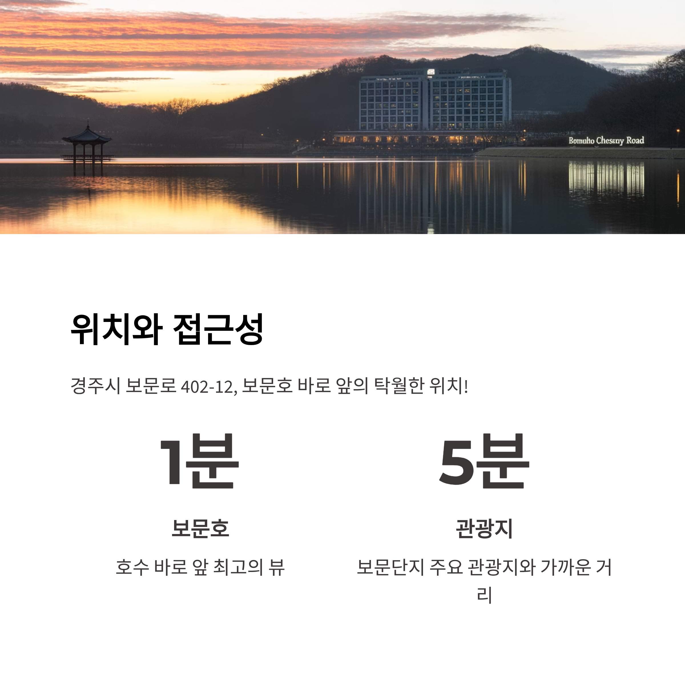 경주시 보문로 402-12에 위치해 있으며, 보문호 바로 앞이라 뷰가 탁월합니다. 보문단지 주요 관광지와도 가까워 이동이 편리한 숙소입니다.