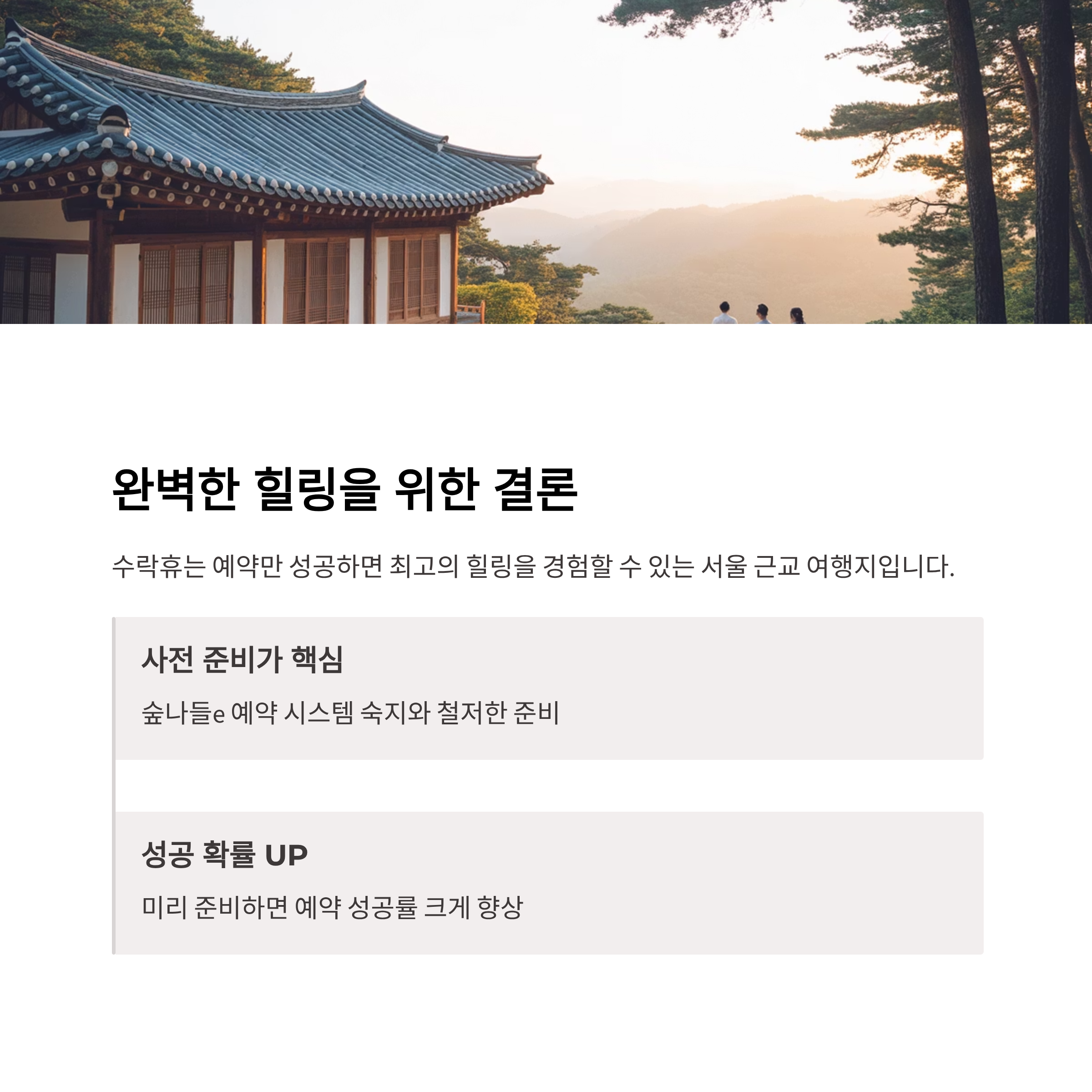수락휴는 예약만 성공하면 최고의 힐링을 경험할 수 있는 서울 근교 여행지입니다. 숲나들e 예약 시스템을 숙지하고 사전 준비를 철저히 하면 성공 확률을 크게 높일 수 있습니다. 숲속에서의 특별한 하루, 이번엔 수락휴에서 만들어 보세요.