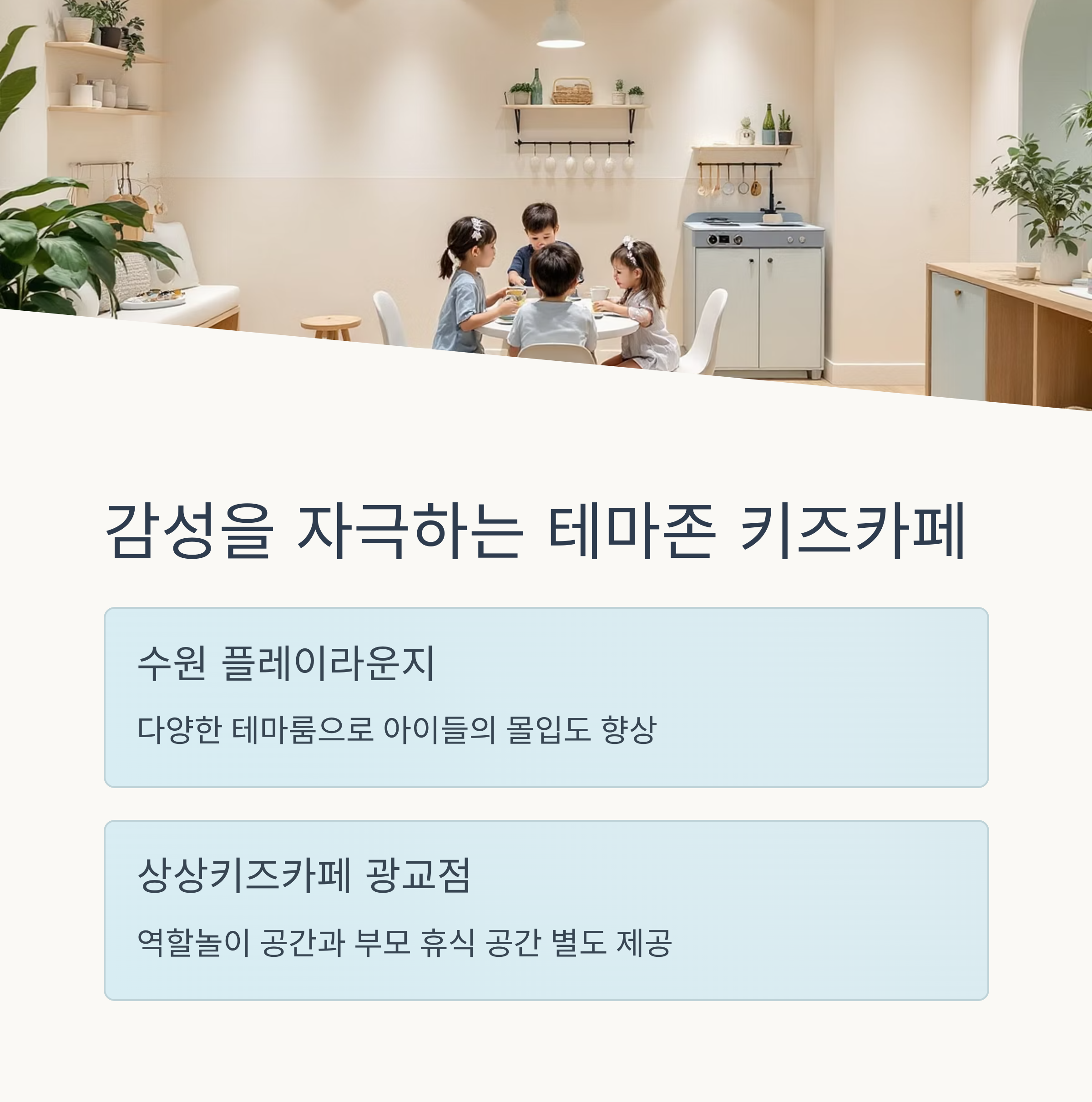 "수원 플레이라운지", "상상키즈카페 광교점" 등은 각기 다른 테마룸이 분리되어 있어