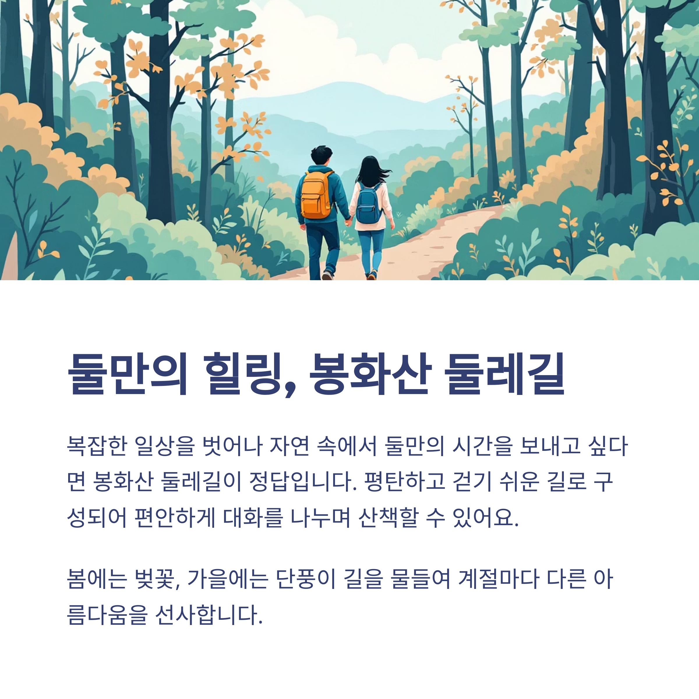 편안하게 자연을 즐기며 대화를 나누기 좋은 코스예요.