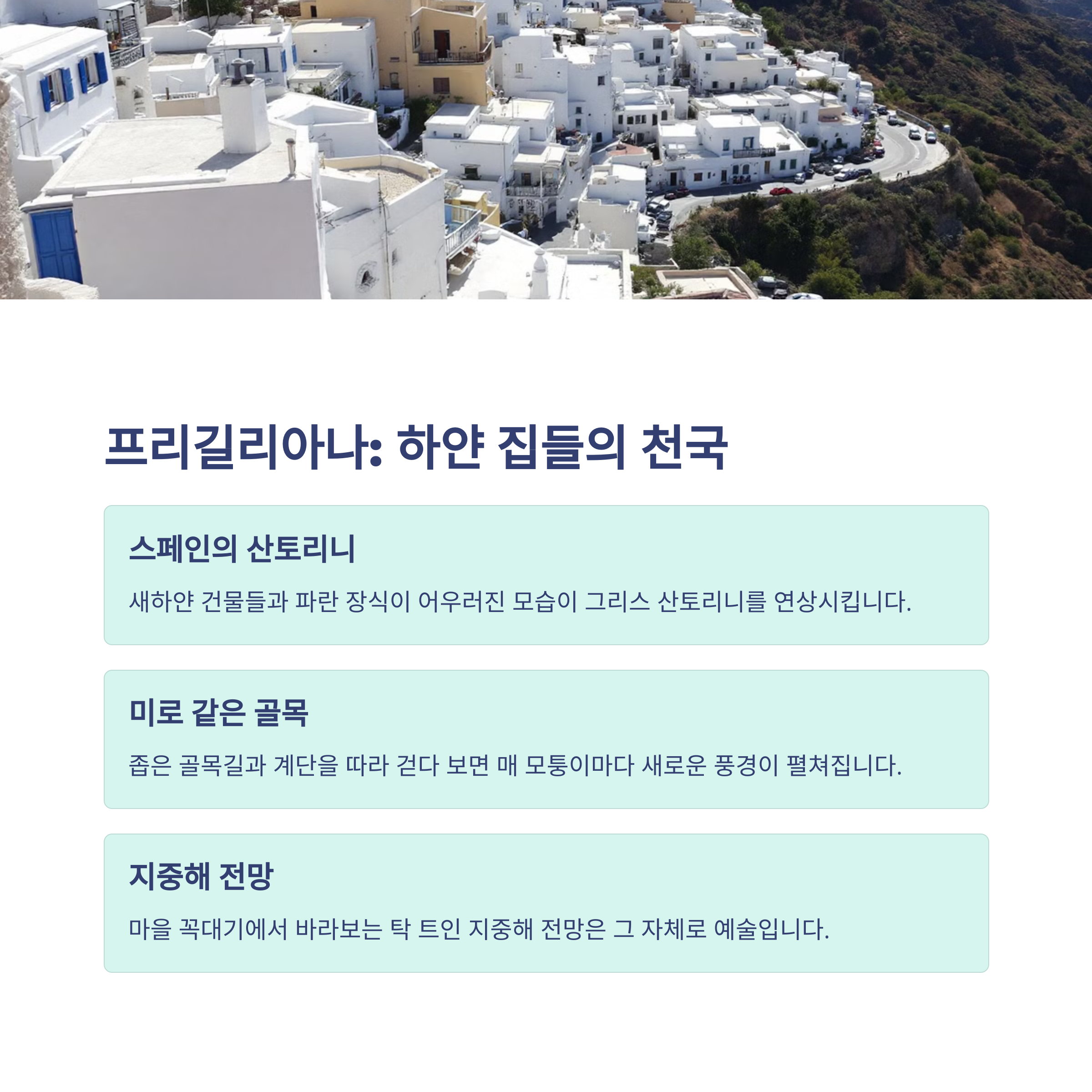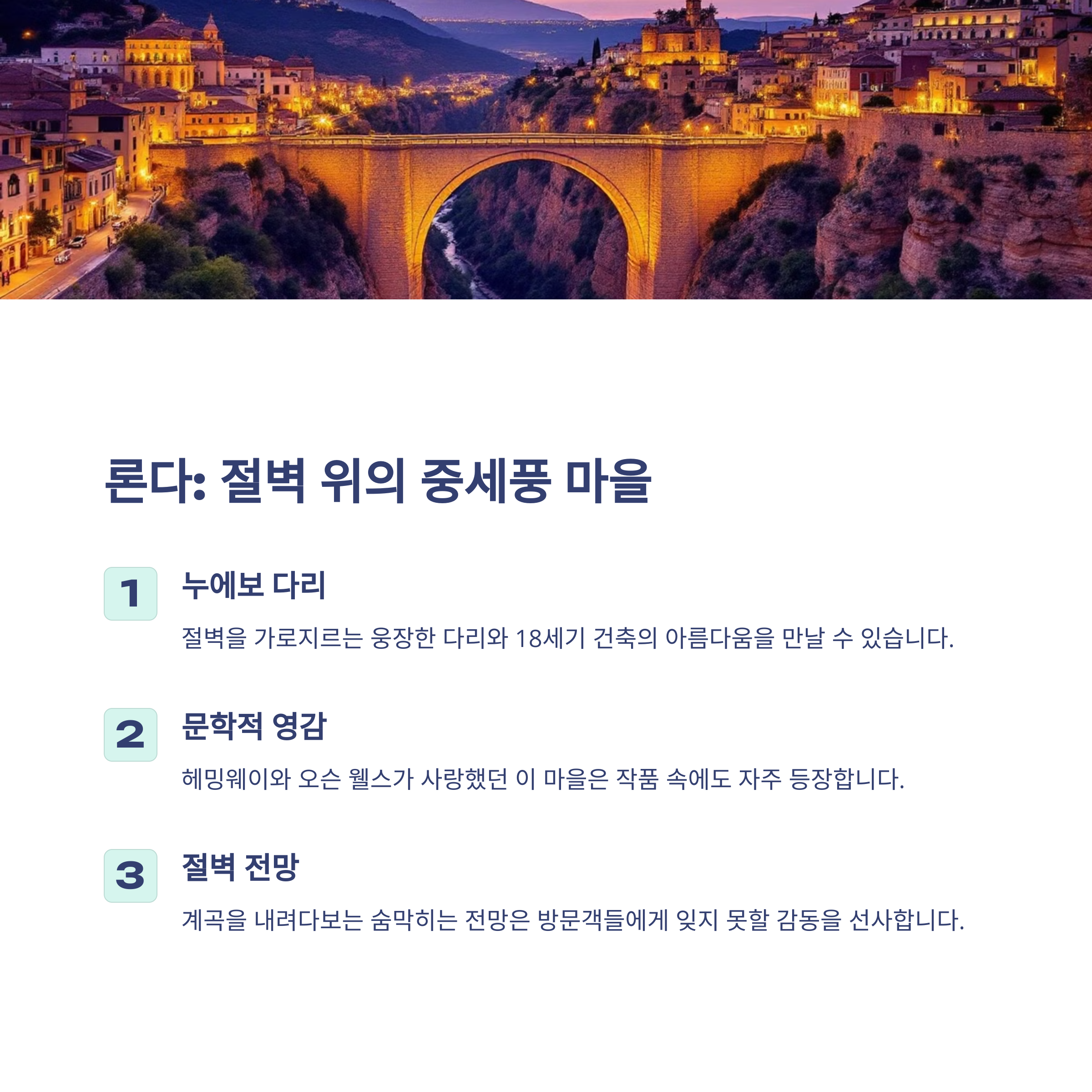 🏡 론다 – 절벽 위에 자리한 중세풍 마을 ☀️ 프리길리아나 – 하얀 집들이 늘어선 스페인의 가장 아름다운 마을 🌿 베사우 – 카탈루냐 지방의 자연 속 평화로운 마을 🎨 카다케스 – 달리의 흔적이 남아 있는 예술적인 공간 🍷 라 리오하 – 와인 향이 가득한 작은 마을에서의 특별한 하루