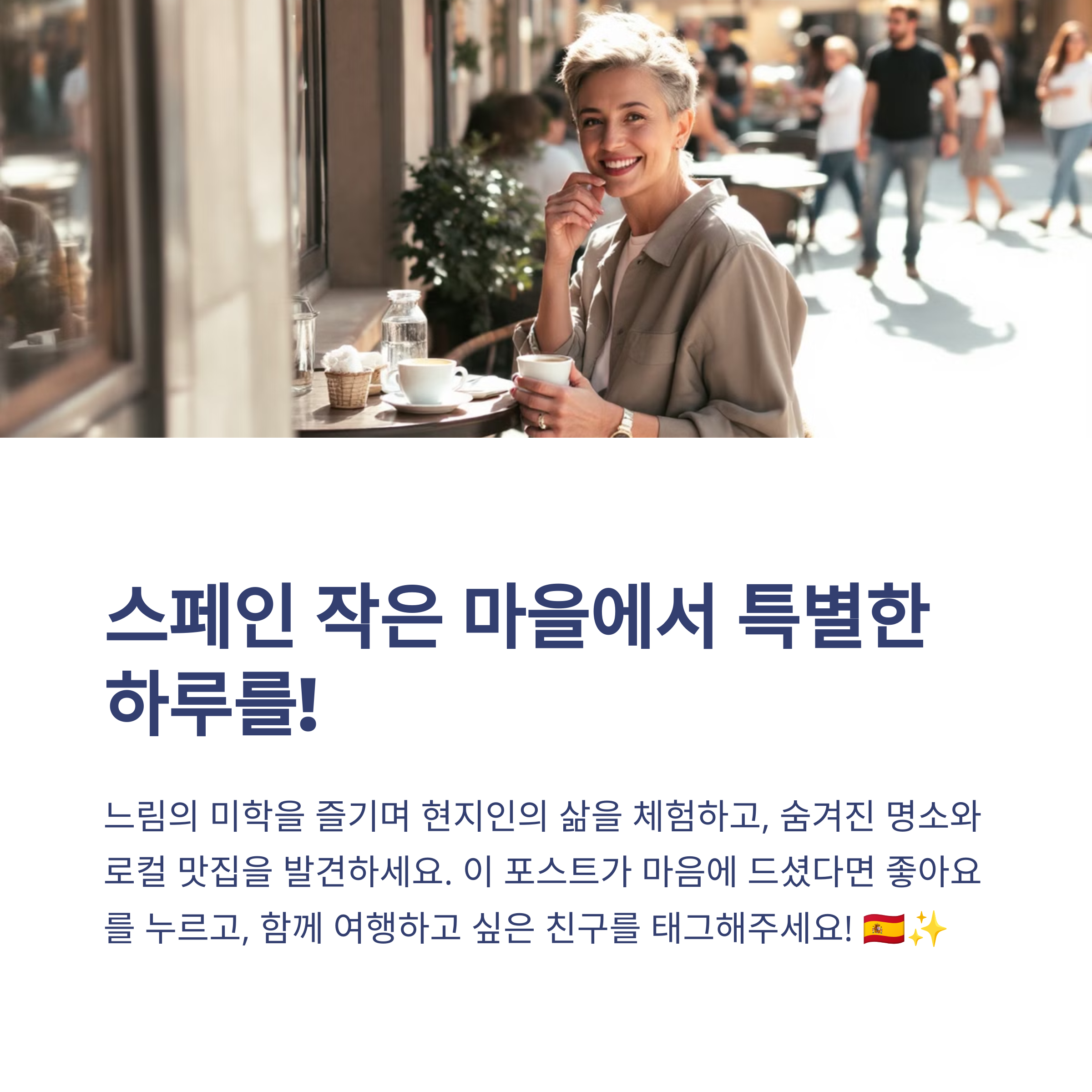 스페인의 작은 마을에서는 바쁜 일정 대신 여유를 즐길 수 있습니다. 맛있는 현지 음식, 한적한 광장, 골목길 산책으로 특별한 하루를 보내 보세요!