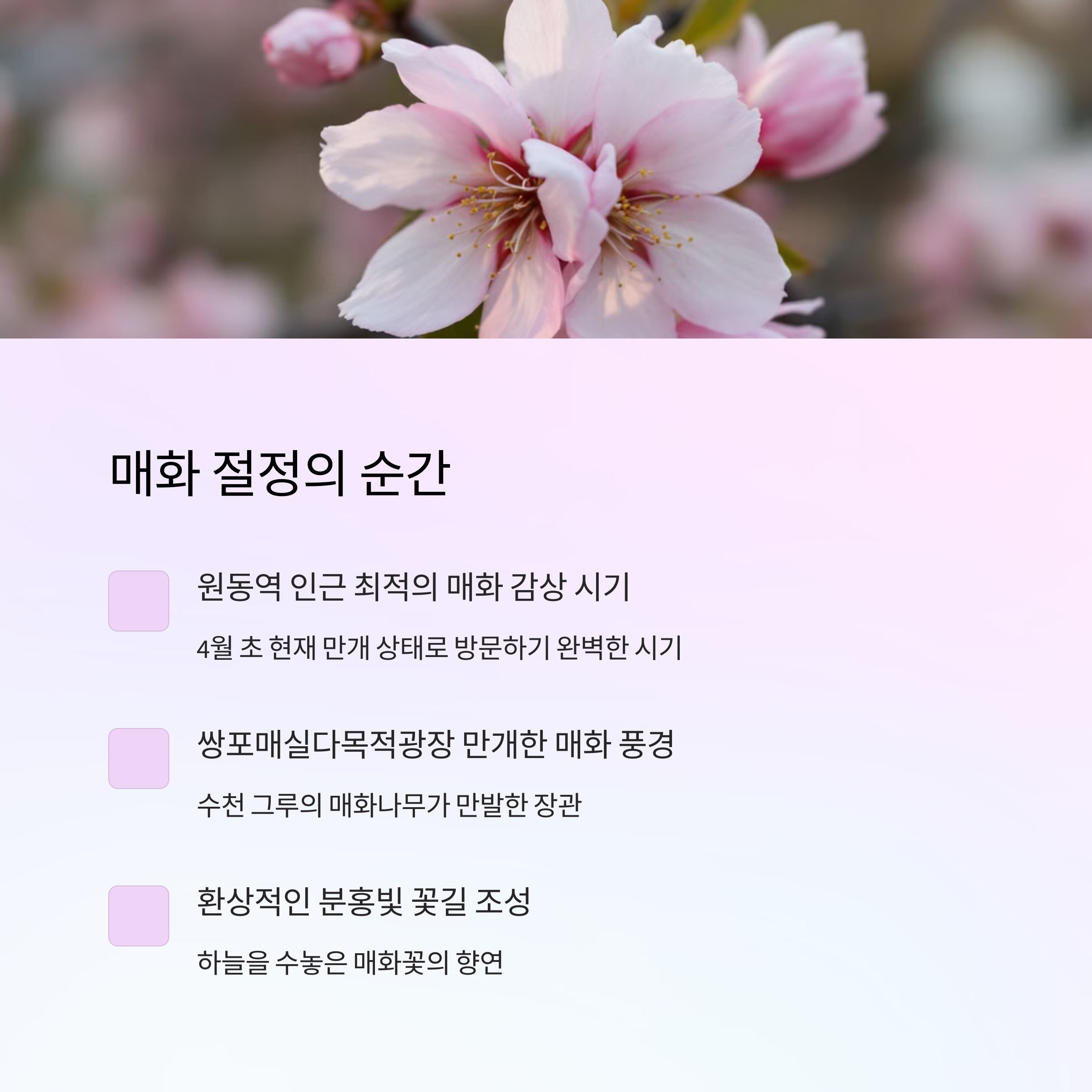 | 원동매화 절정 시기 | 4월 초 현재 만개 상태로 최적기 |