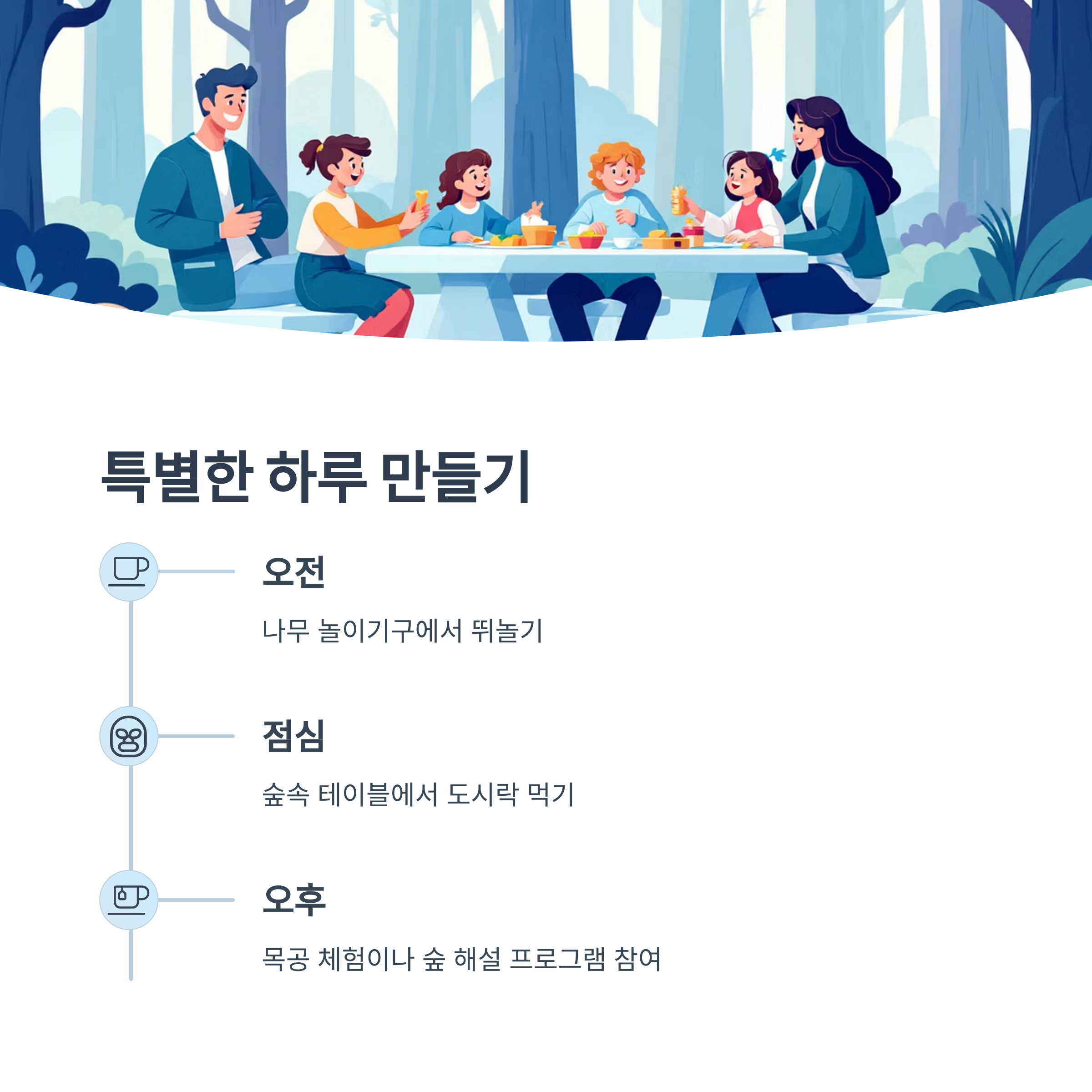 아침 일찍 도착해 나무 놀이기구에서 뛰놀고, 점심은 숲속 테이블에서 도시락을 먹고,