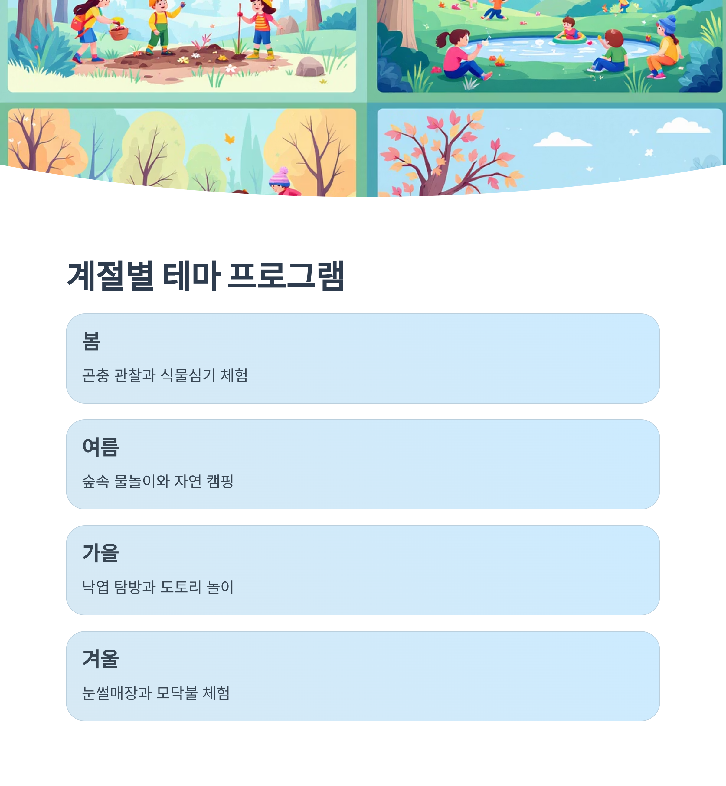 가을엔 낙엽 탐방과 도토리 놀이, 겨울엔 눈썰매장과 모닥불 체험 등