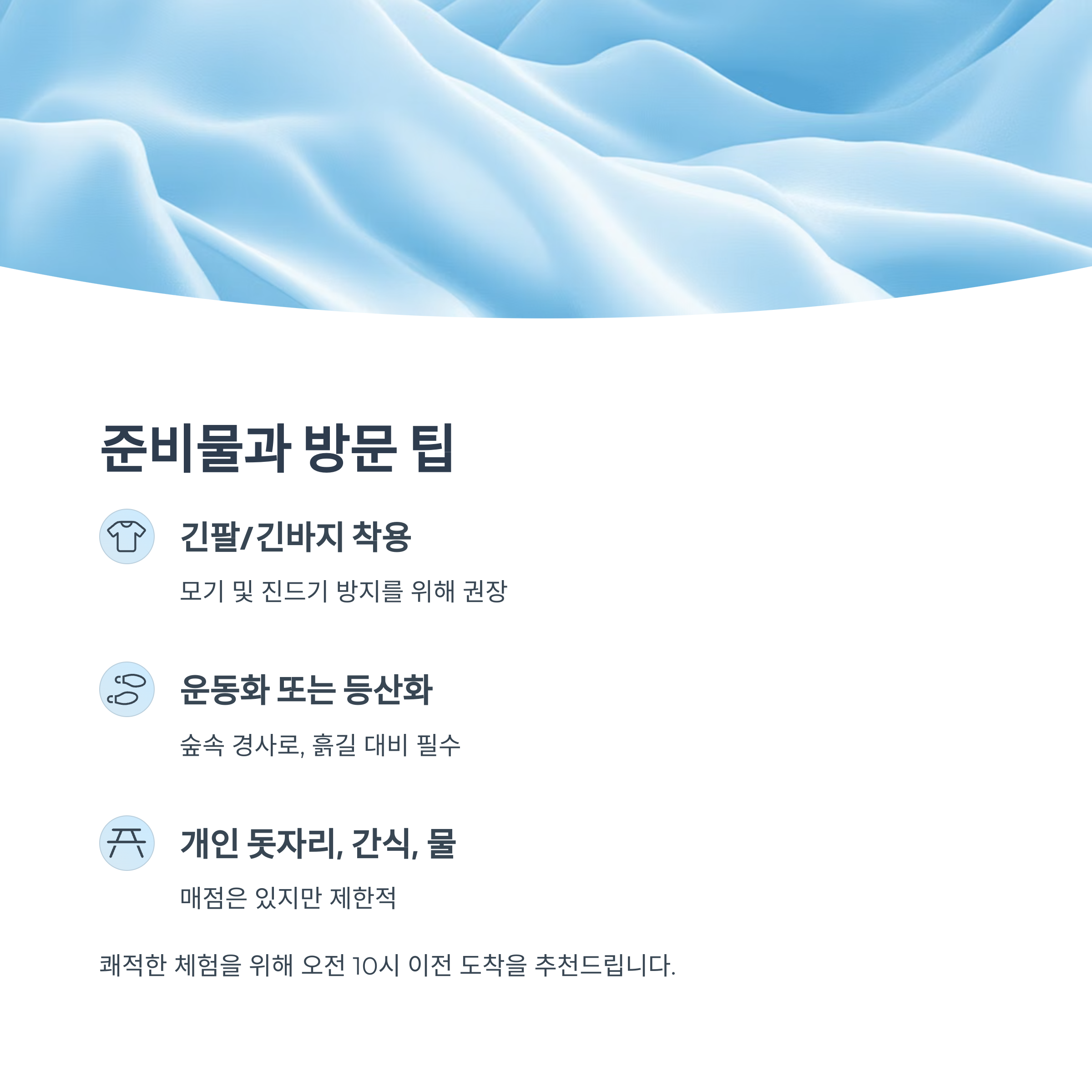 - 운동화 또는 등산화 필수: 숲속 경사로, 흙길 대비 필요