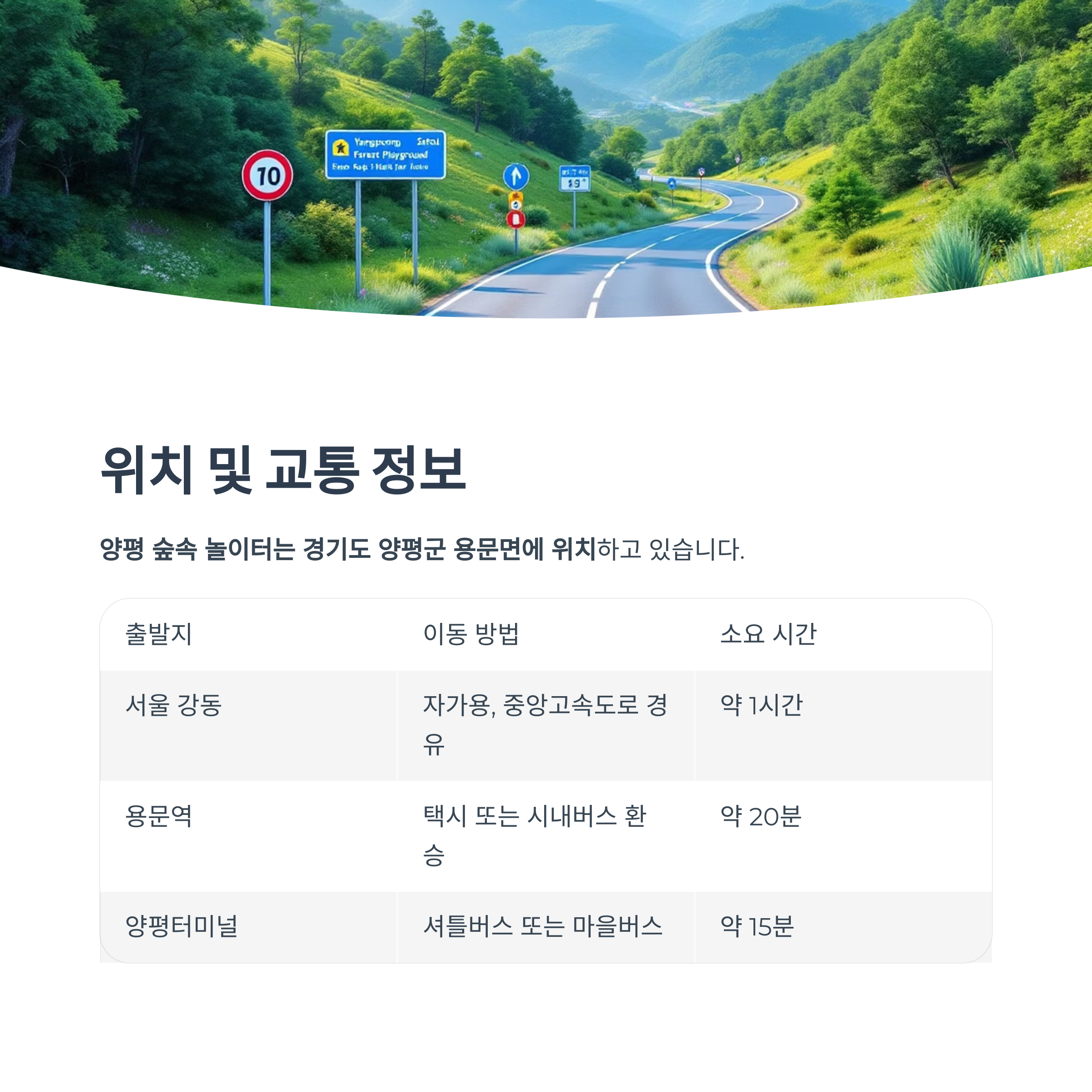 | 서울 강동 | 자가용 이용, 중앙고속도로 경유 | 약 1시간 |