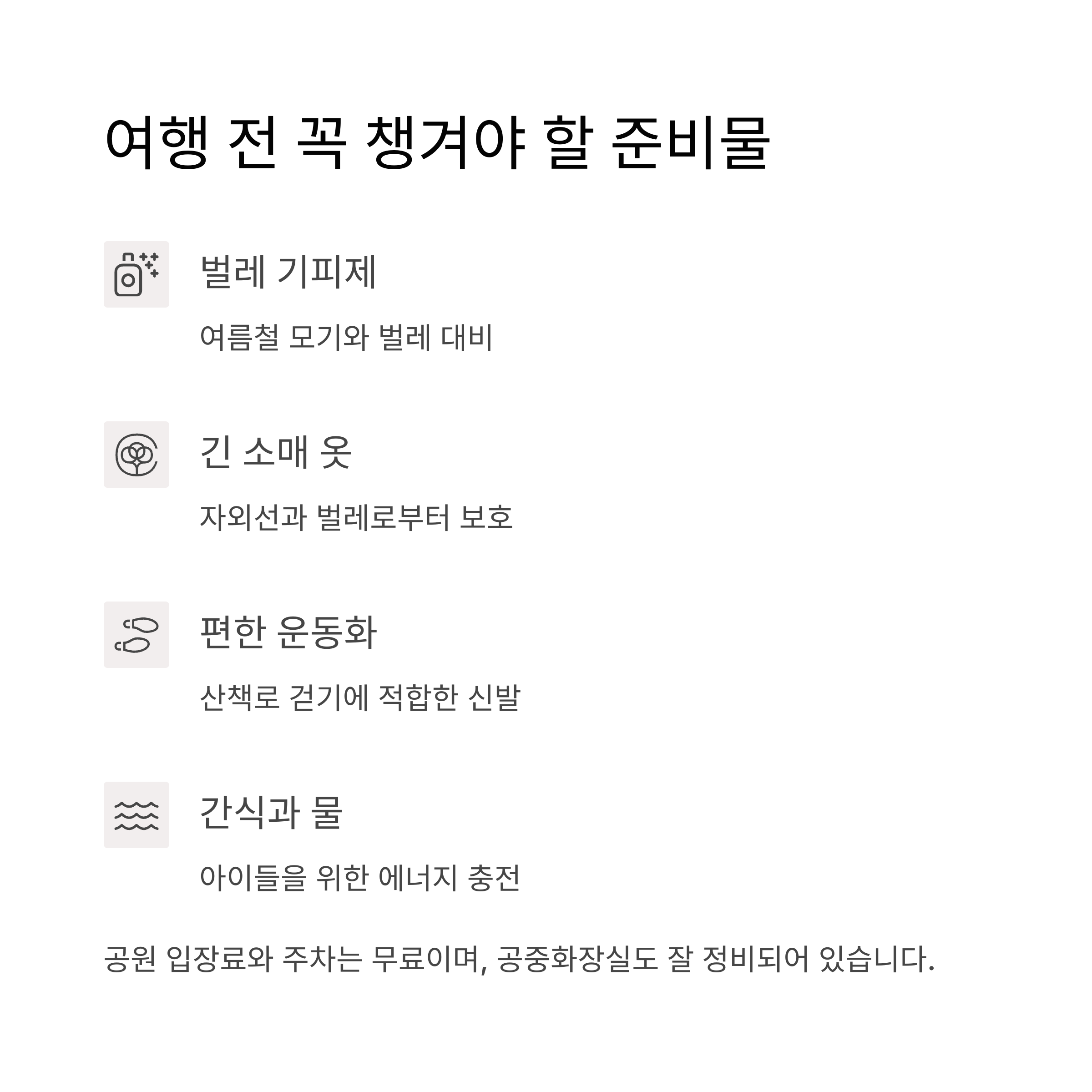 여름철에는 모기나 벌레가 많을 수 있어 벌레 기피제와 긴 소매 옷 준비가 필수입니다.