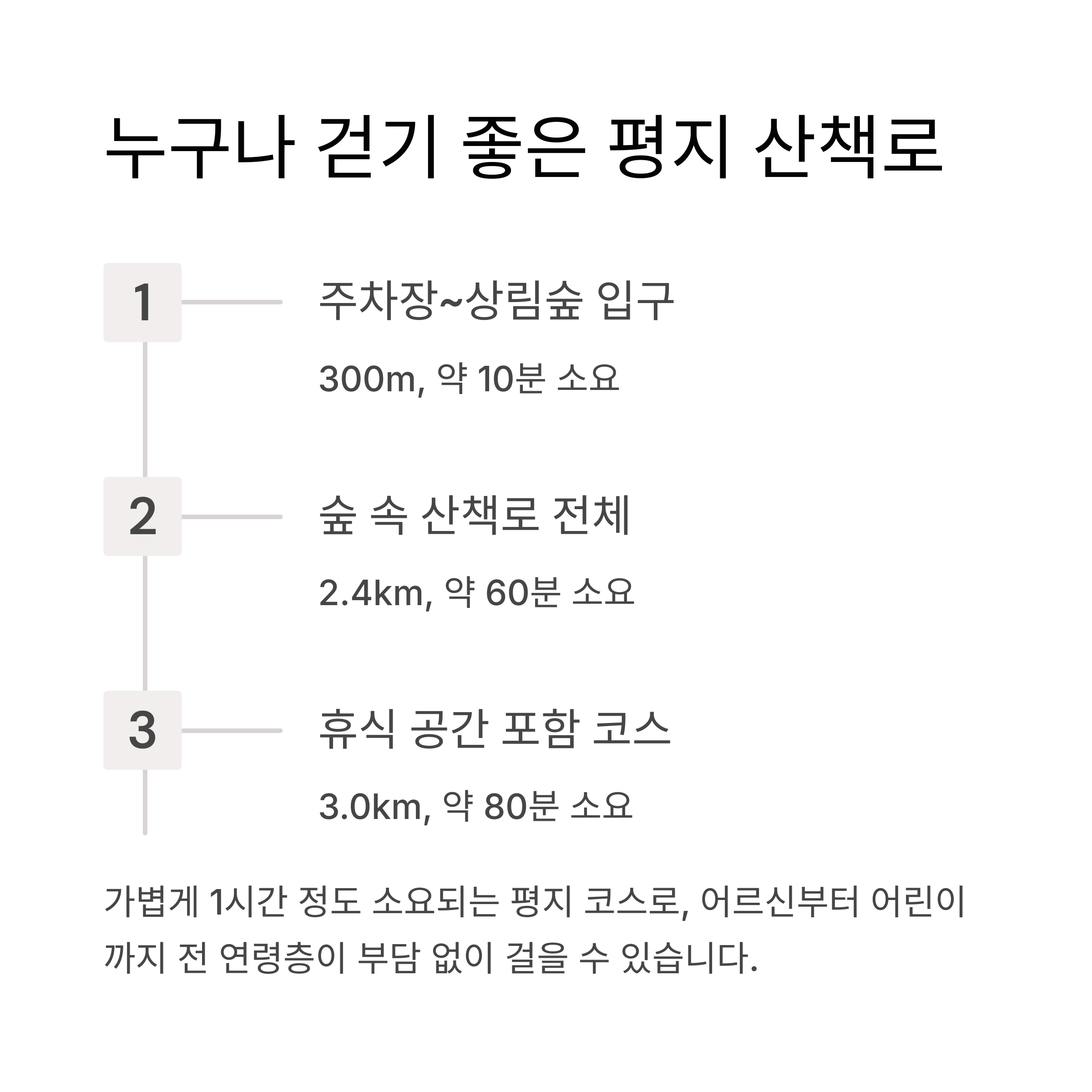 | 주차장~상림숲 입구 | 300m | 약 10분 |