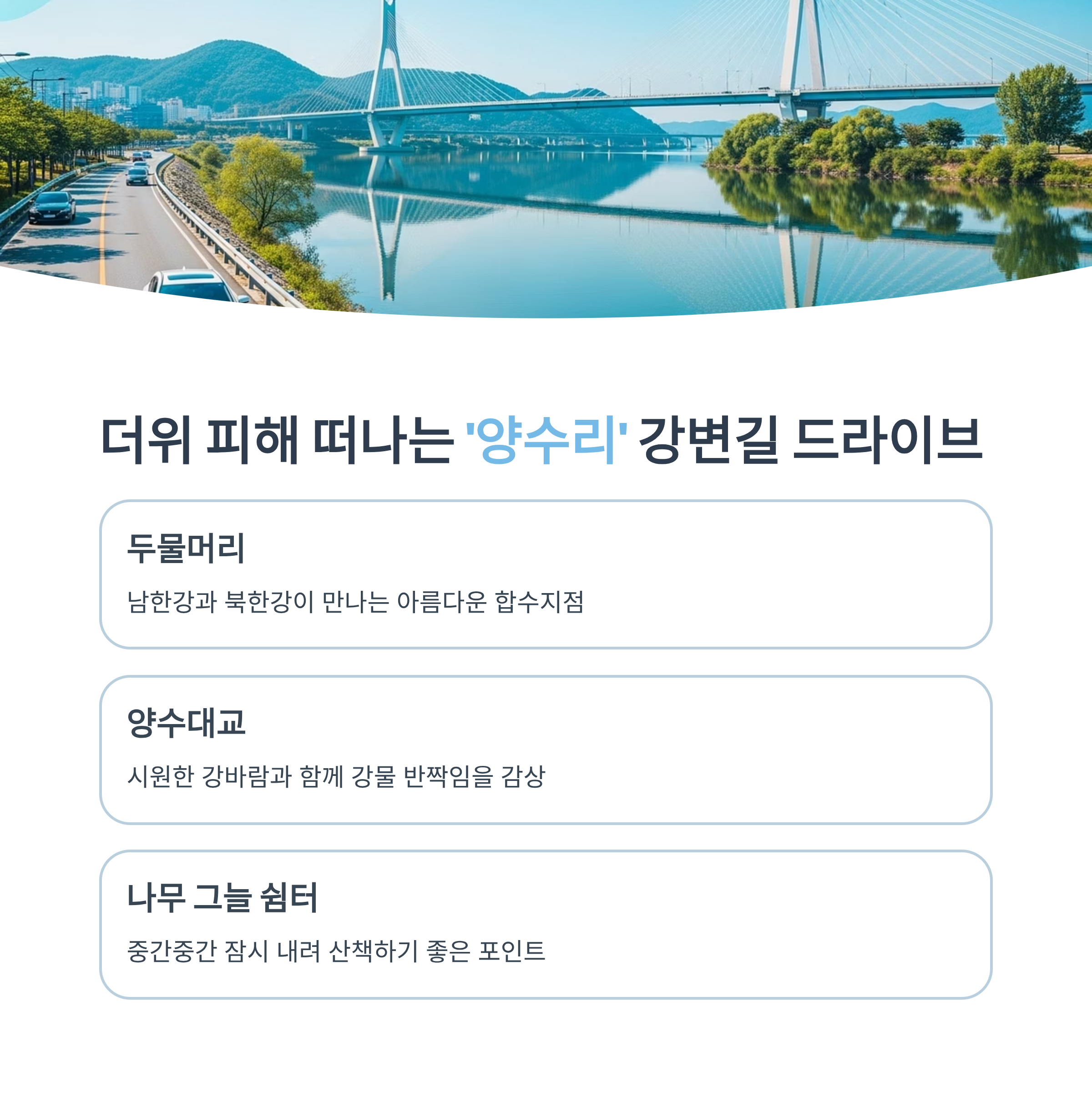 양평은 서울에서 가깝고 자연이 잘 보존되어 있어 여름철 드라이브 여행지로 꾸준히 사랑받고 있습니다. 특히 푸른 산과 계곡, 탁 트인 강변길은 에어컨보다 시원한 청량함을 안겨줍니다. 이번 글에서는 양평의 대표적인 드라이브 코스와 함께 들르면 좋은 명소, 여름에만 즐길 수 있는 숨겨진 포인트까지 자세히 소개해드립니다.