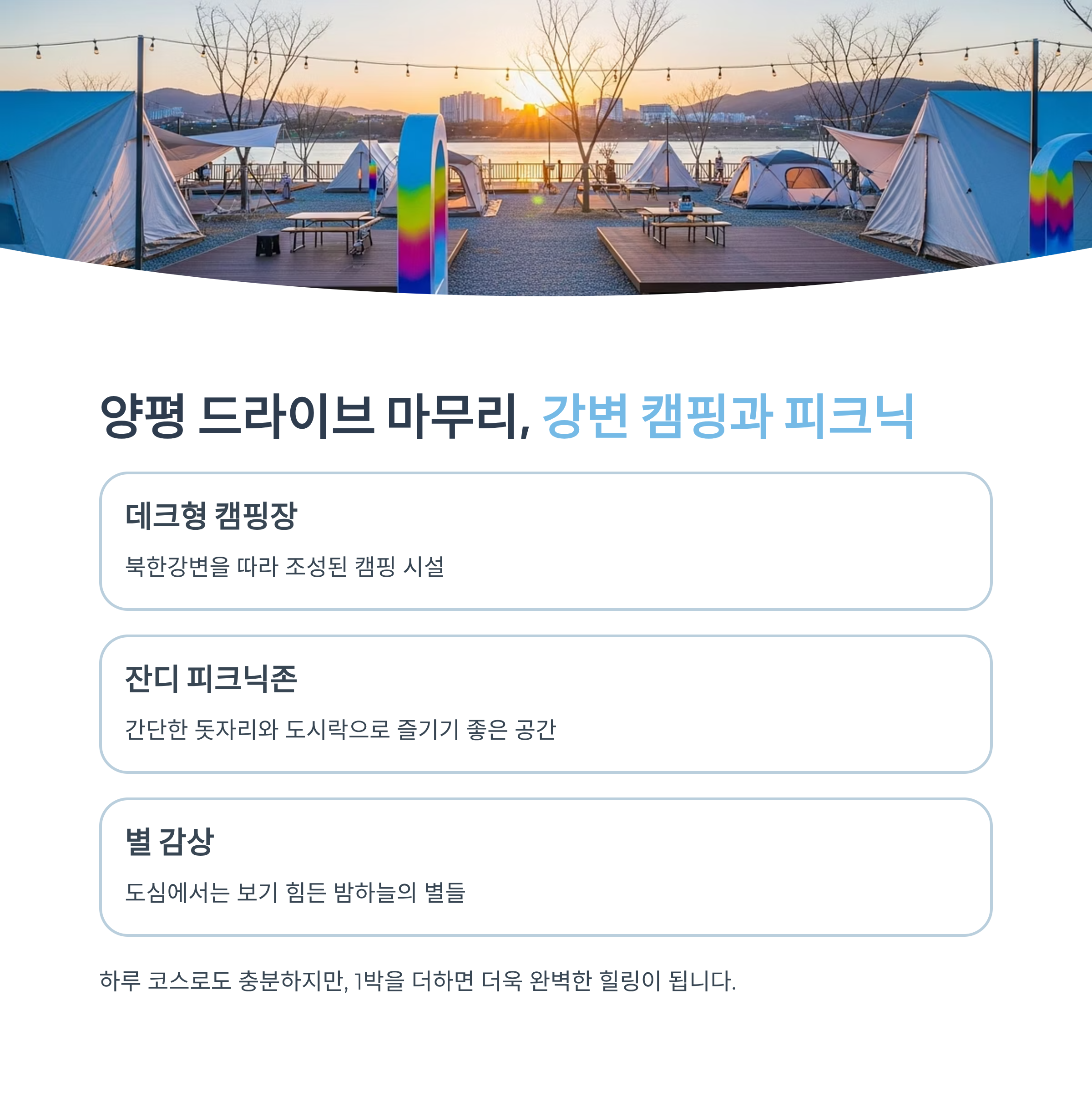 강가에서 1박 캠핑이나 피크닉으로 마무리하면 더욱 좋습니다.