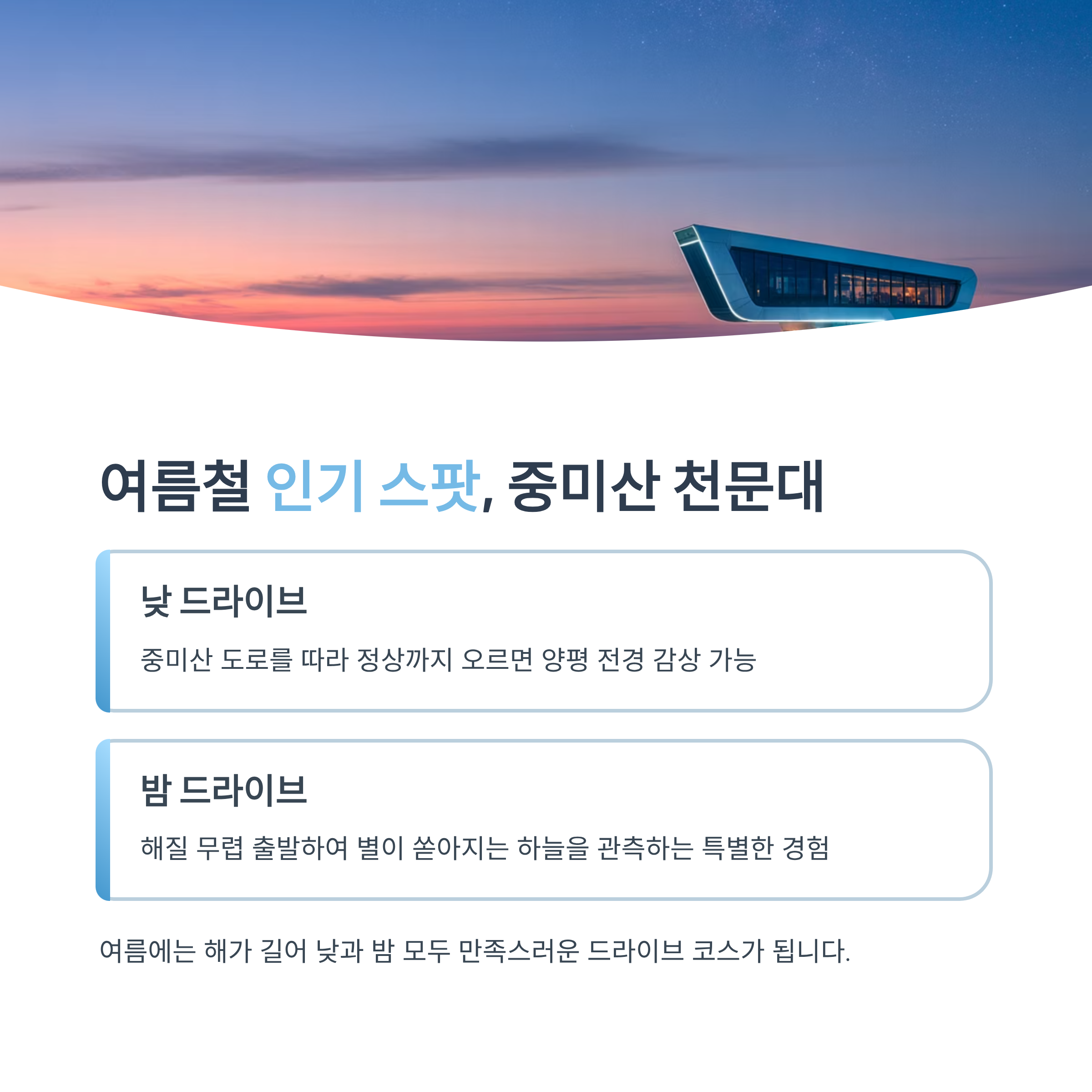 밤 드라이브도 매력적입니다. 해질 무렵 중미산 도로를 따라