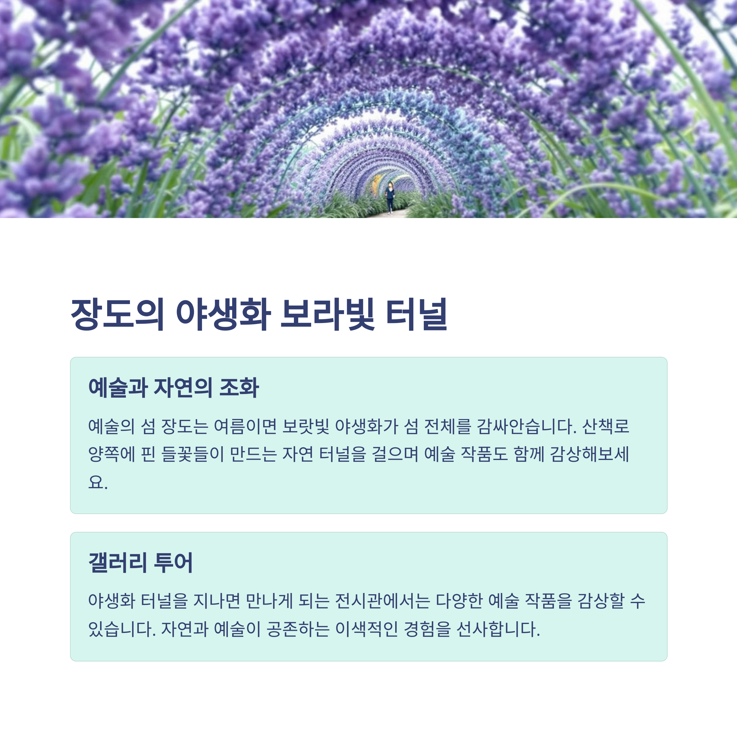 장도에는 여름이면 야생화가 흐드러지게 피는데, 특히 보랏빛 들꽃들이 섬 전체를 감쌉니다.