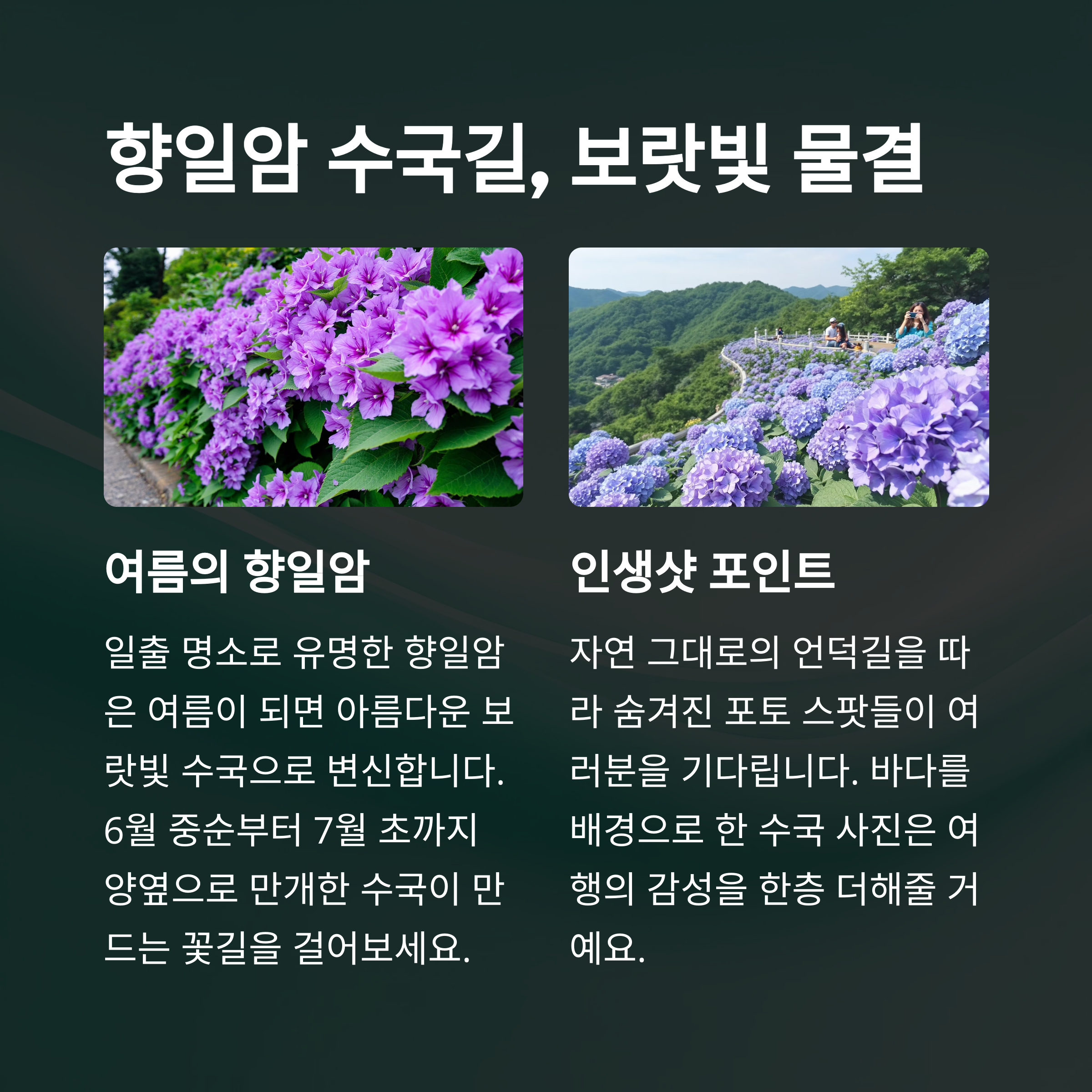 향일암은 일출 명소로 잘 알려져 있지만, 여름에는 수국이 만개하면서 보랏빛 꽃길이 펼쳐집니다.