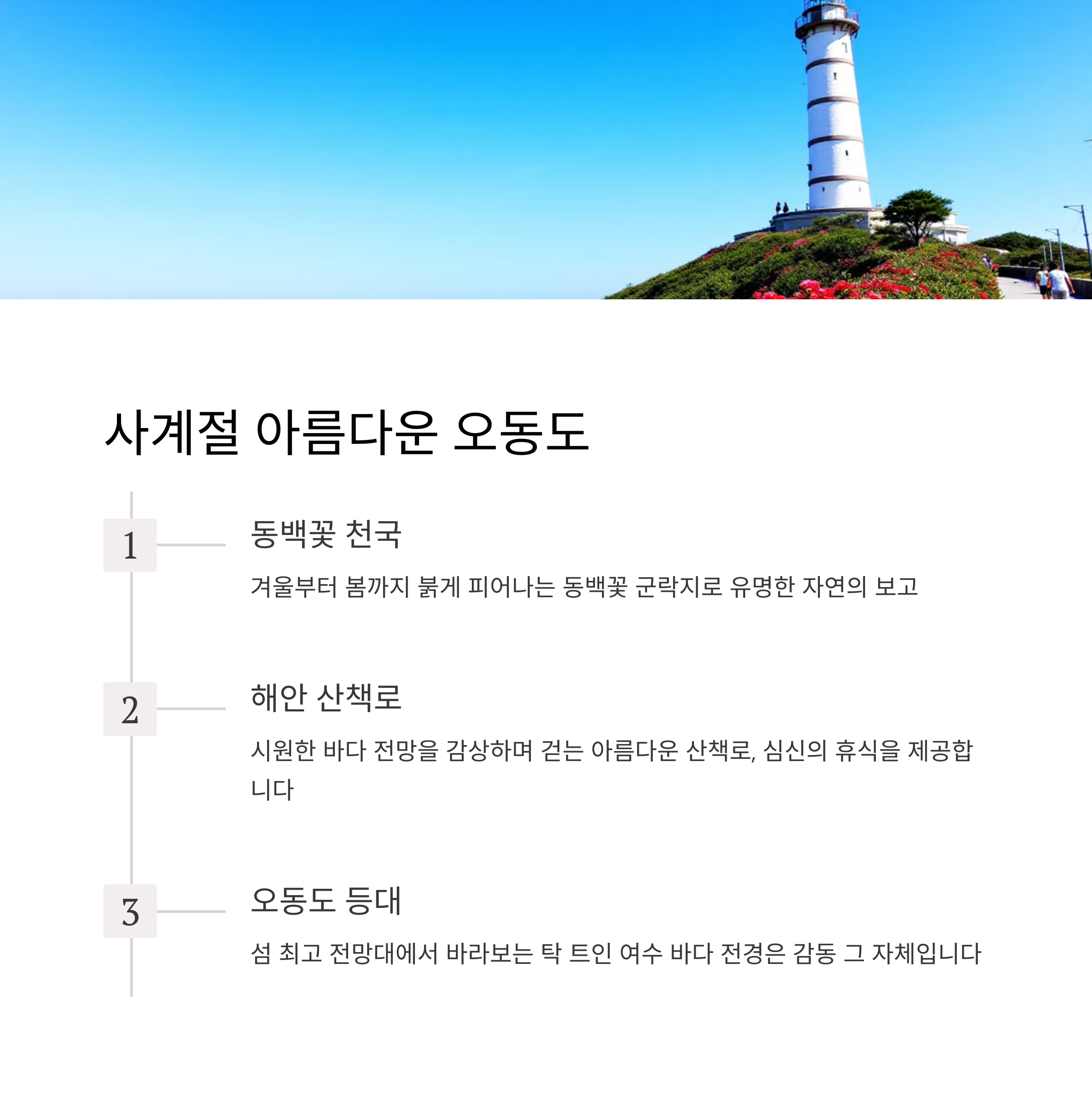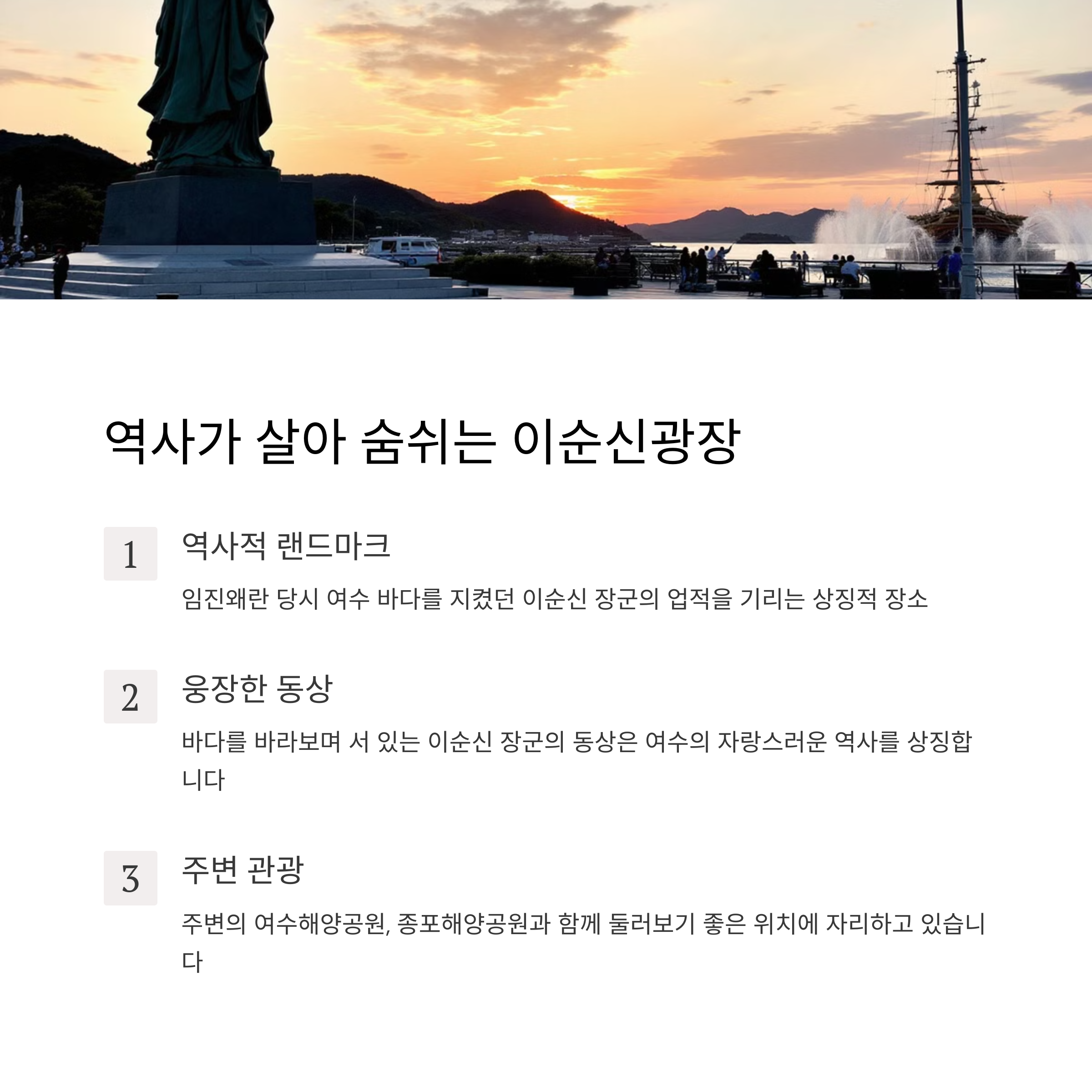 | 여수 여행 키워드 | 바다, 해변, 야경, 해산물, 낭만 여행, 맛집 투어 |