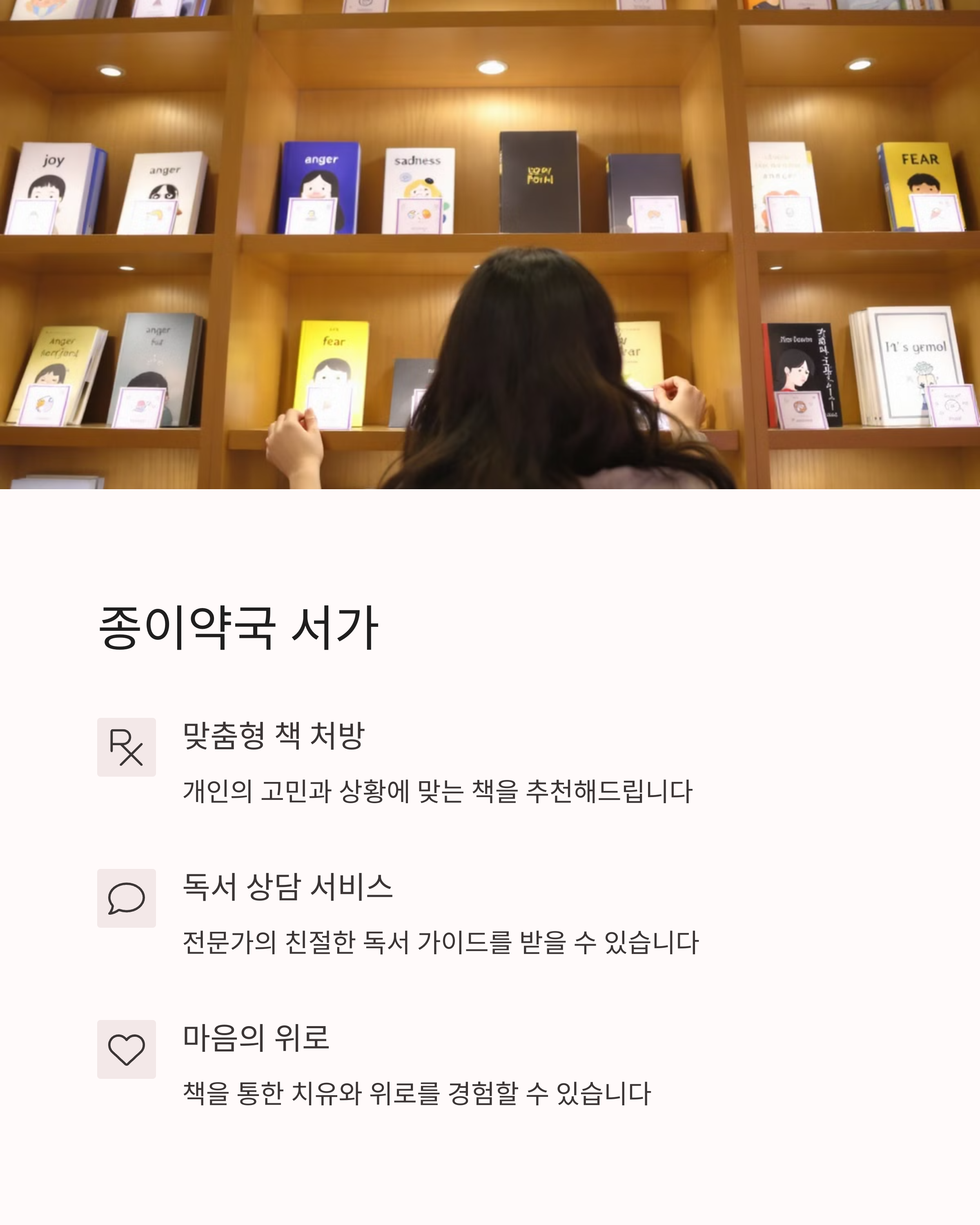 | 중소벤처기업부 인증, 70년 전통 서점 | 감정에 맞춘 책을 처방해주는 특별 코너 | 지역 주민과 여행자 모두의 사랑을 받는 장소 |