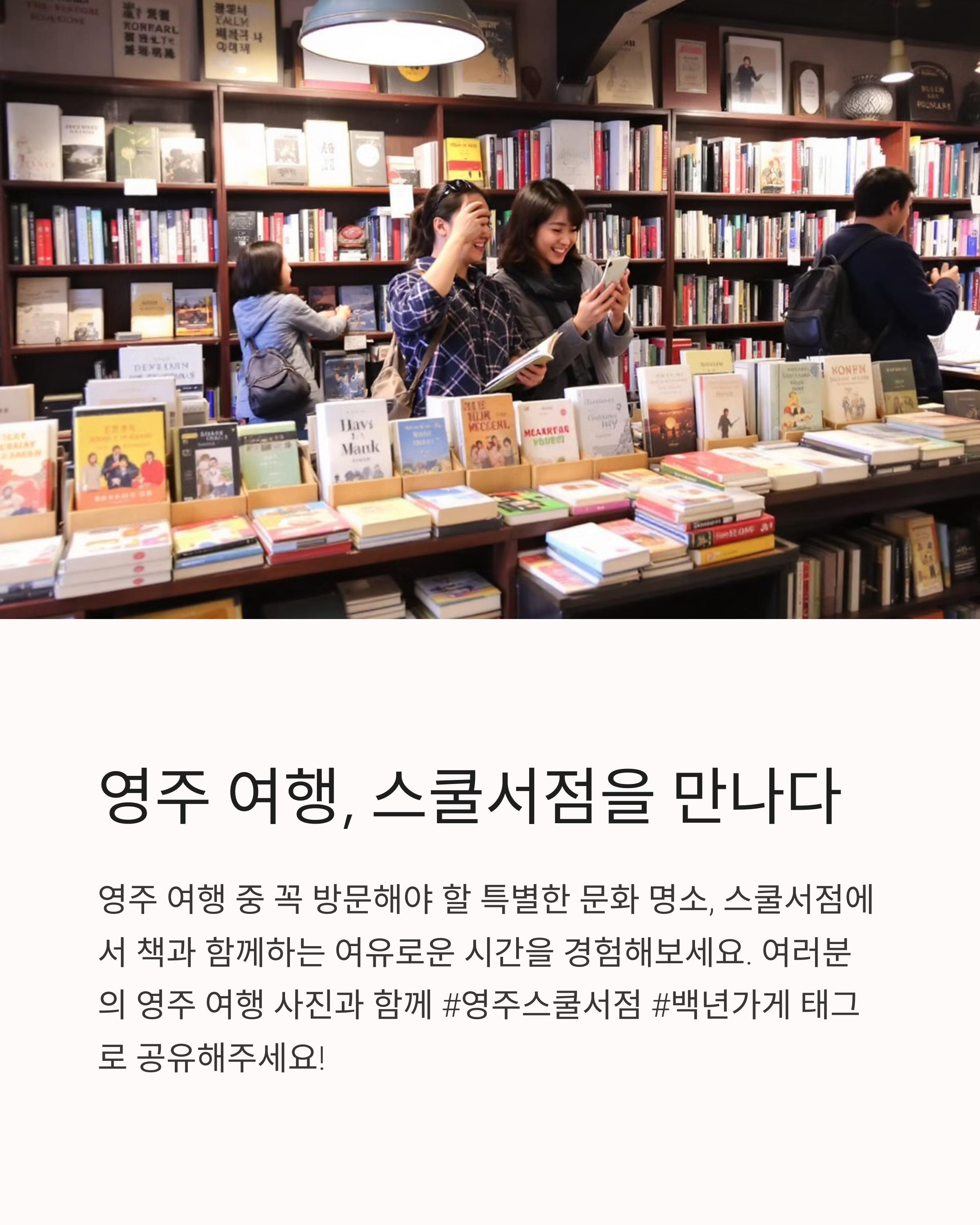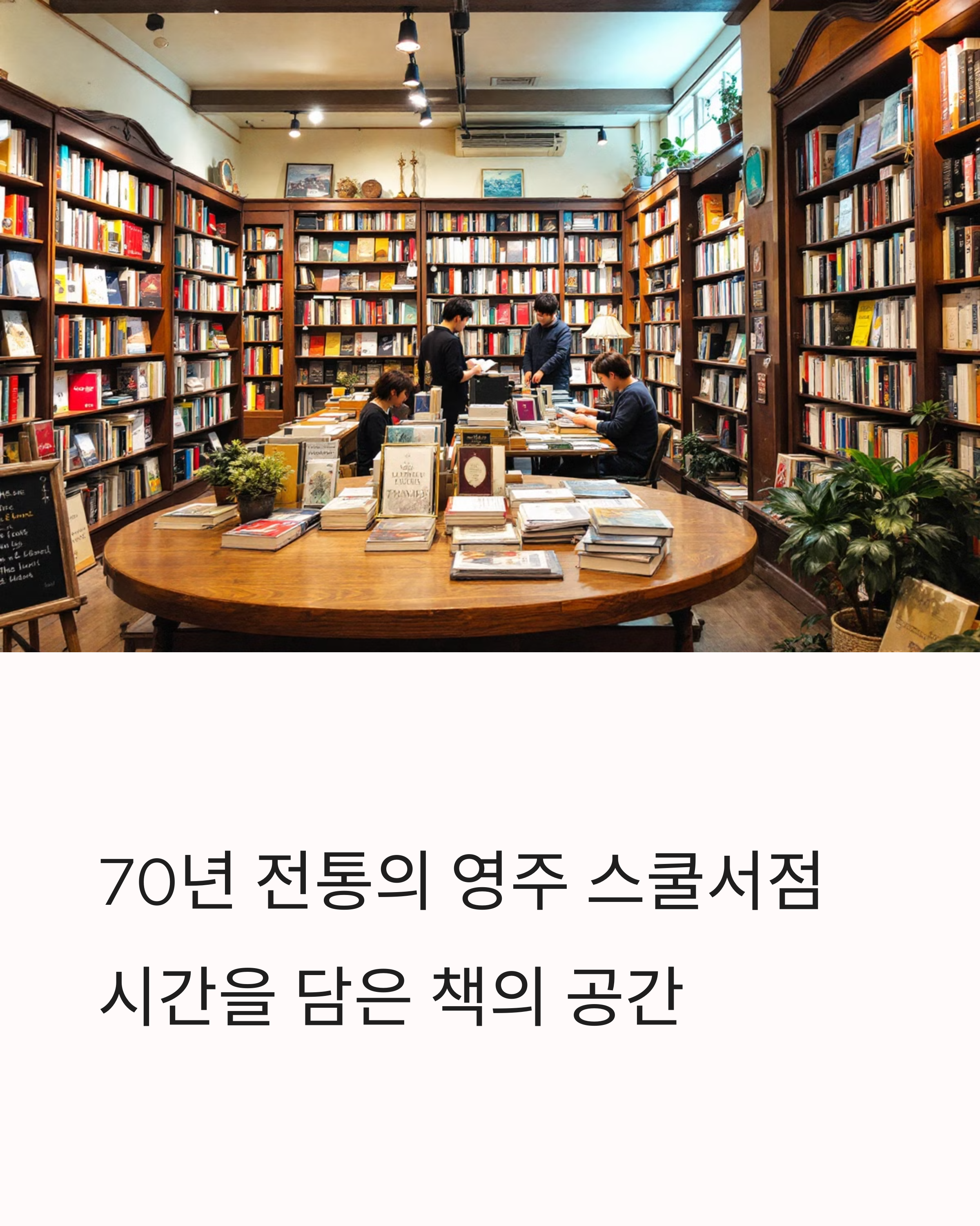 책을 좋아하는 사람이라면, 스쿨서점에서의 시간은 단순한 독서의 경험을 넘어 과거와 현재, 그리고 감정과 이야기를 오가는 여정입니다. 영주를 방문한다면 잠시 들러, 익숙한 책 한 권 혹은 처음 만나는 문장을 통해 자신만의 이야기를 만나는 경험을 해보시길 바랍니다. 오랜 시간이 켜켜이 쌓인 이 공간은 조용히, 그러나 분명하게 우리에게 말을 겁니다.