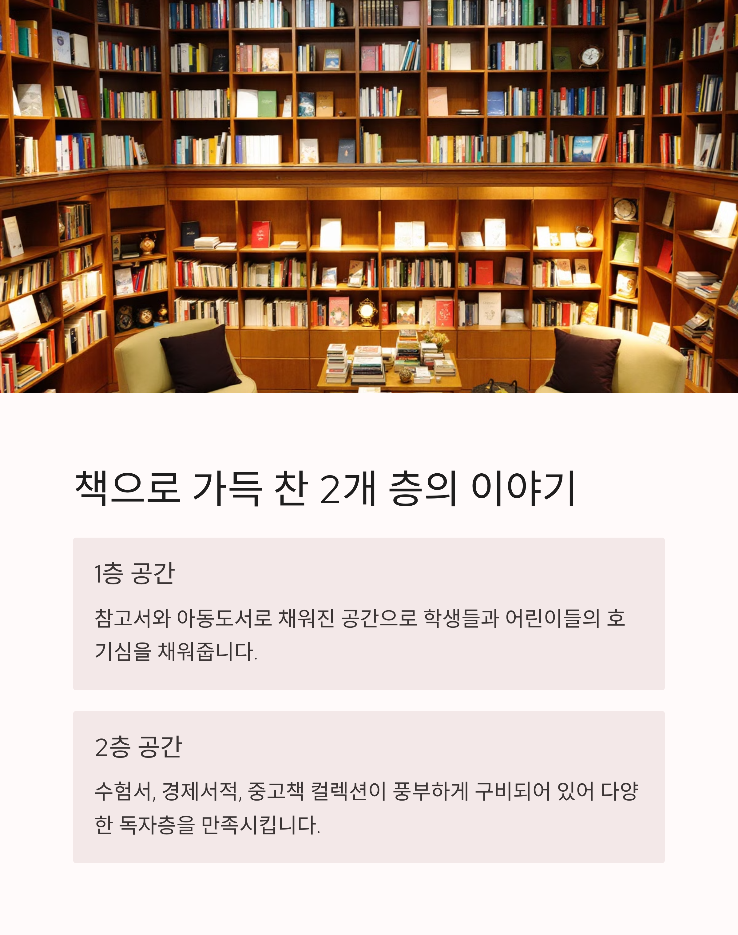 스쿨서점은 층별 구성도 매우 체계적입니다. 1층은 아동도서, 참고서, 교재 위주로 구성되어 있어 학생들이 자주 찾는 공간입니다. 2층은 수험서와 경제·경영 등 실용서 위주로 배치되어 있으며, 중고서적도 함께 판매되고 있어 절판된 책이나 희귀본을 찾는 재미도 쏠쏠합니다. 공간이 넓지 않지만 분야별로 정갈하게 정리되어 있어 직접 책장을 넘기며 고르는 즐거움을 만끽할 수 있습니다. 서점 안에는 종이냄새와 나무 향이 어우러져 독서에 최적화된 분위기를 만들어줍니다.