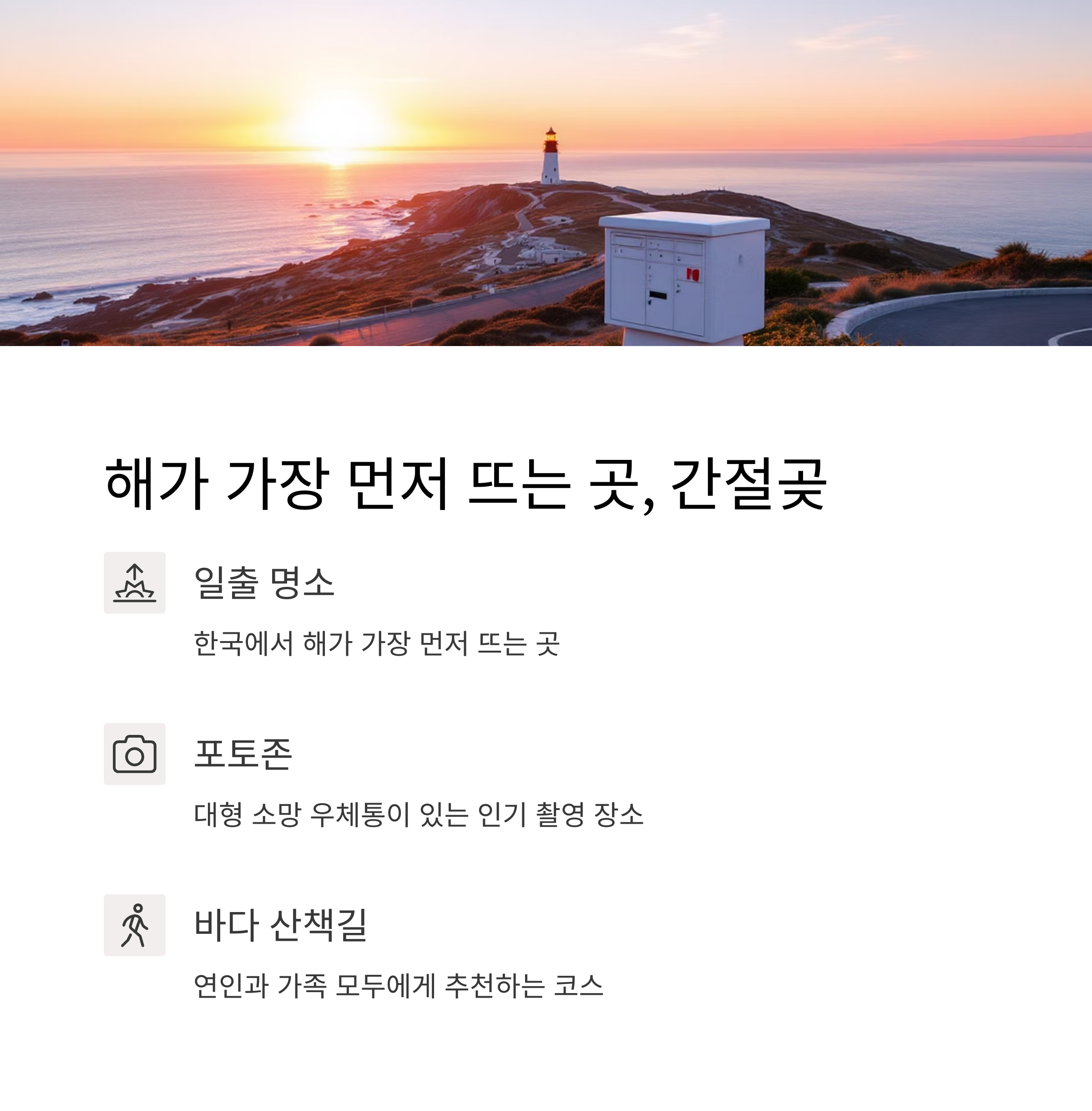 특히 일출 명소로 유명하며, 새벽 출사나 감성적인 산책에 잘 어울립니다.