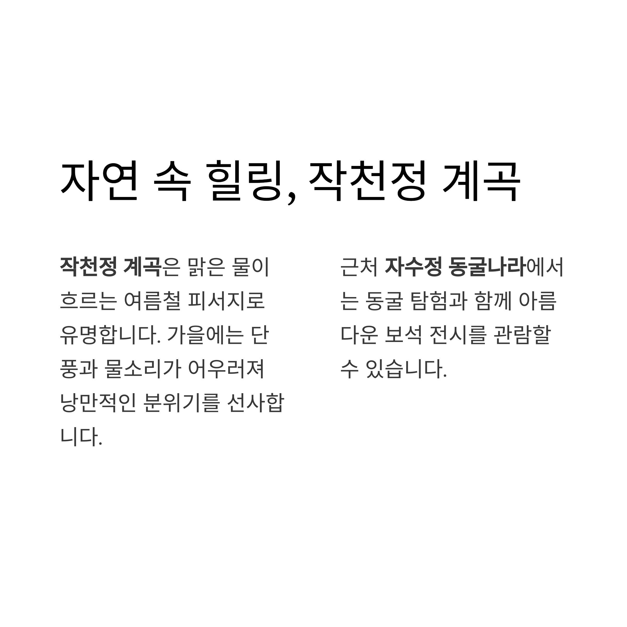 조용한 자연 속에서 힐링을 원한다면 작천정 계곡이 제격입니다.