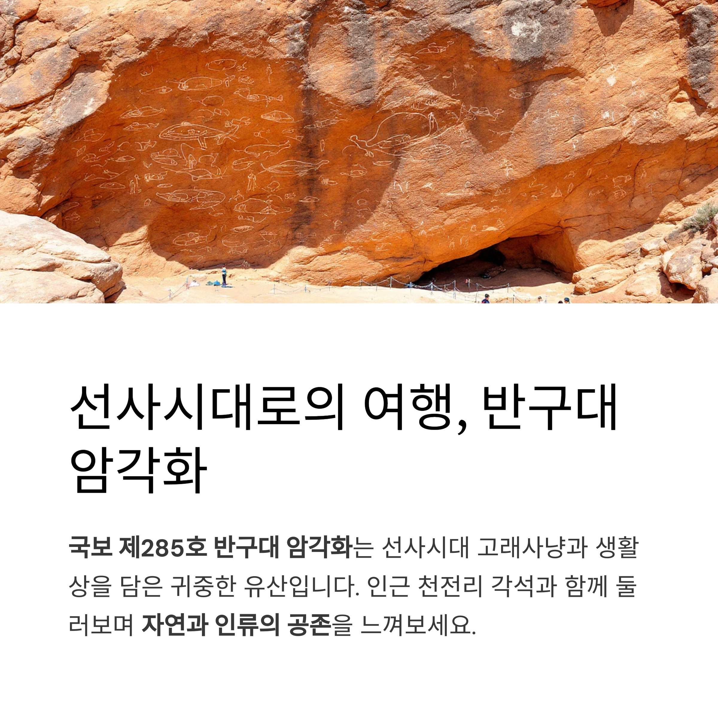 인근 천전리 각석과 함께 둘러보면 자연과 인류의 공존을 느낄 수 있는 의미 있는 여행이 됩니다.