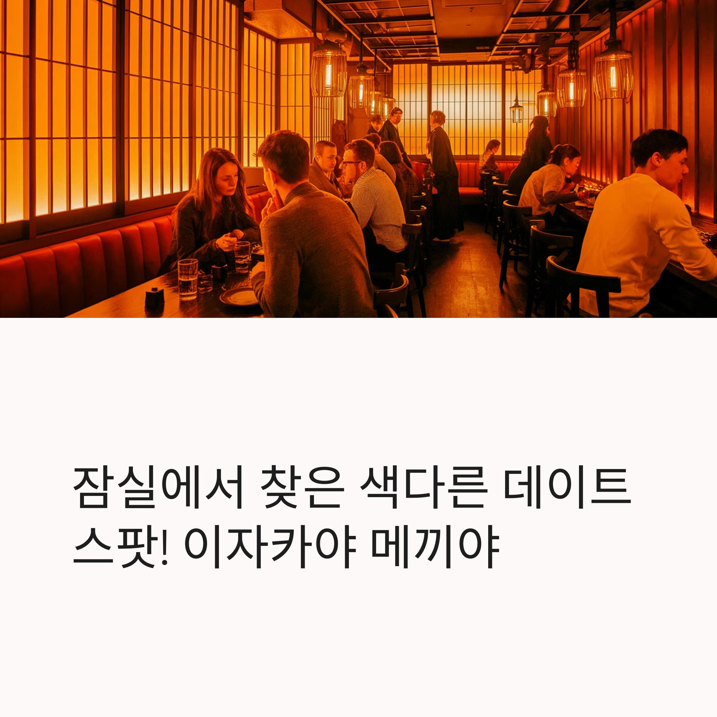바쁜 일상 속, 잠시나마 둘만의 분위기를 즐기고 싶다면 방이먹자골목 속 숨은 이자카야 ‘메끼야’를 추천드립니다. 아늑한 공간과 정갈한 음식, 부드러운 술 한 잔까지. 일본 감성 가득한 저녁 데이트를 원한다면 오늘 저녁, 메끼야에서 특별한 추억을 만들어보세요.