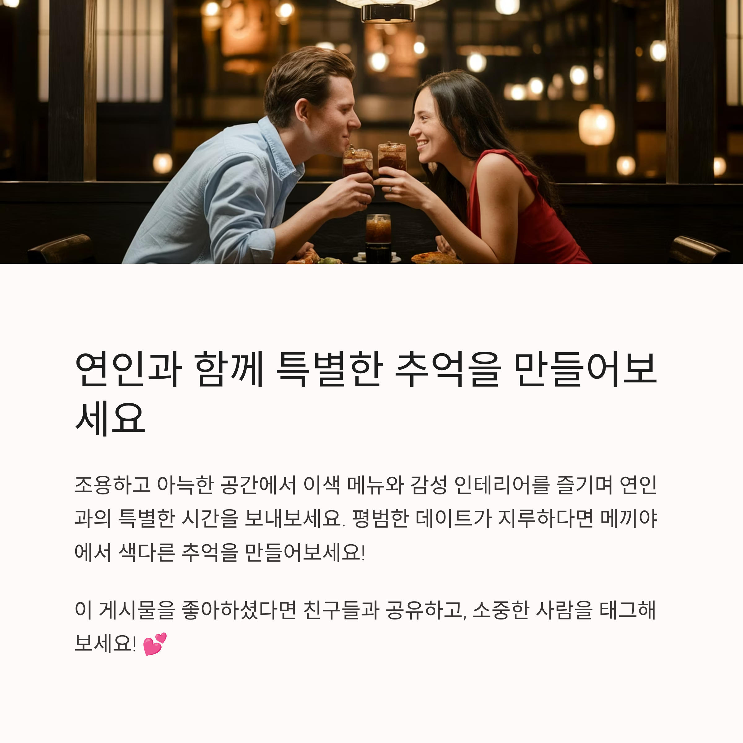 메끼야처럼 분위기 있는 술집, 맛집, 조용한 공간 추천이 있다면 댓글로 공유해주세요! 또 다른 커플의 데이트에 영감이 될 수 있어요 :)