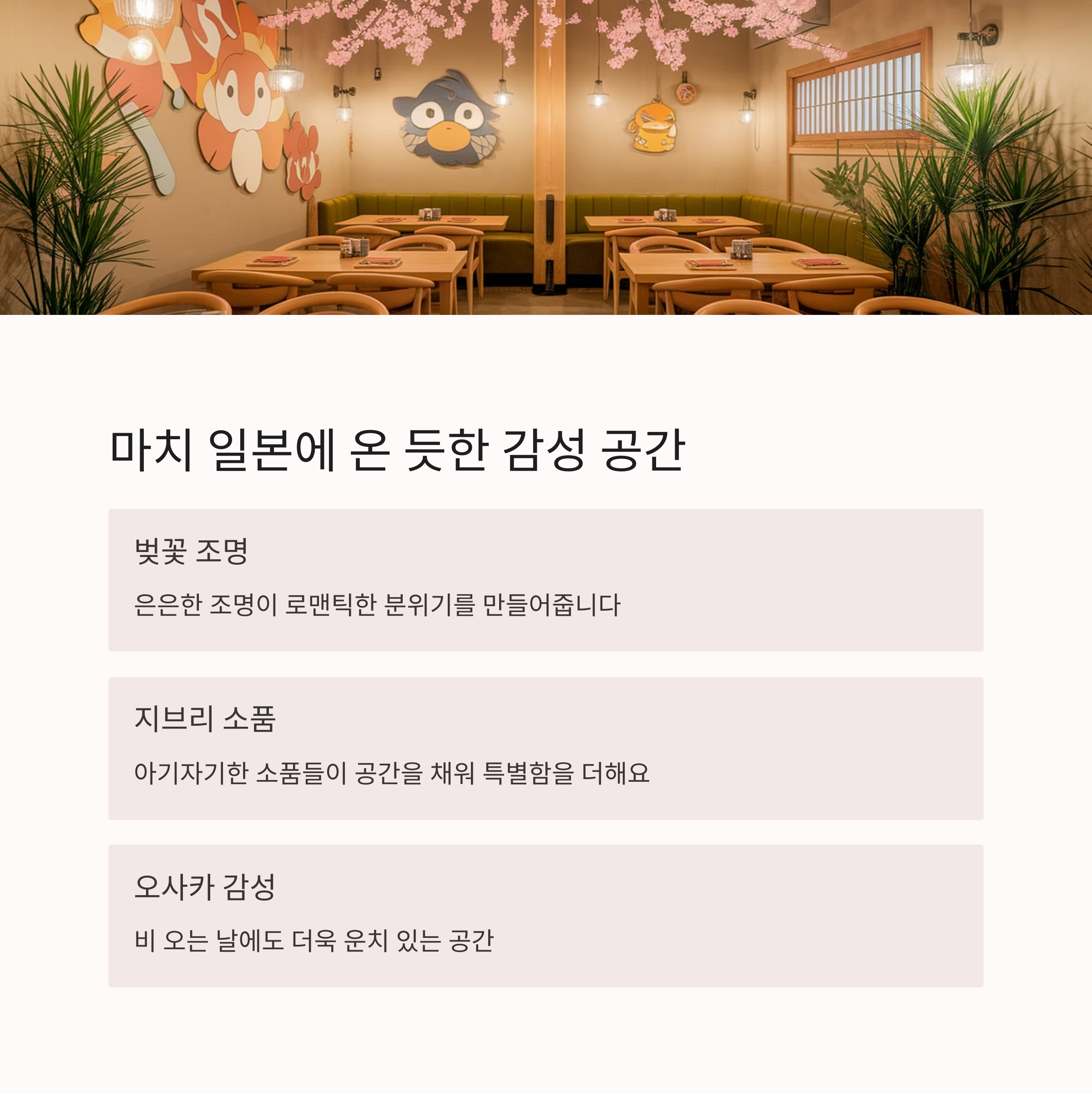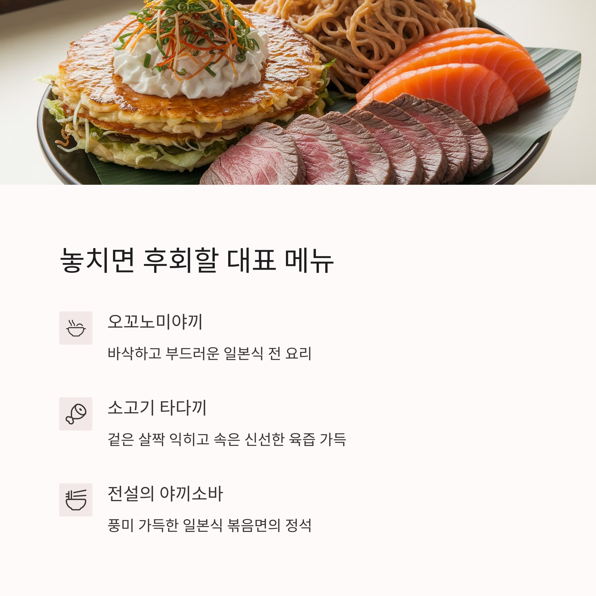 | 오꼬노미야끼, 소고기 타다끼, 야끼소바, 연어사시미 | 아늑하고 조용한 일본식 인테리어, 데이트에 적합 | 하이볼, 생맥주, 일본 사케 다양하게 제공 |