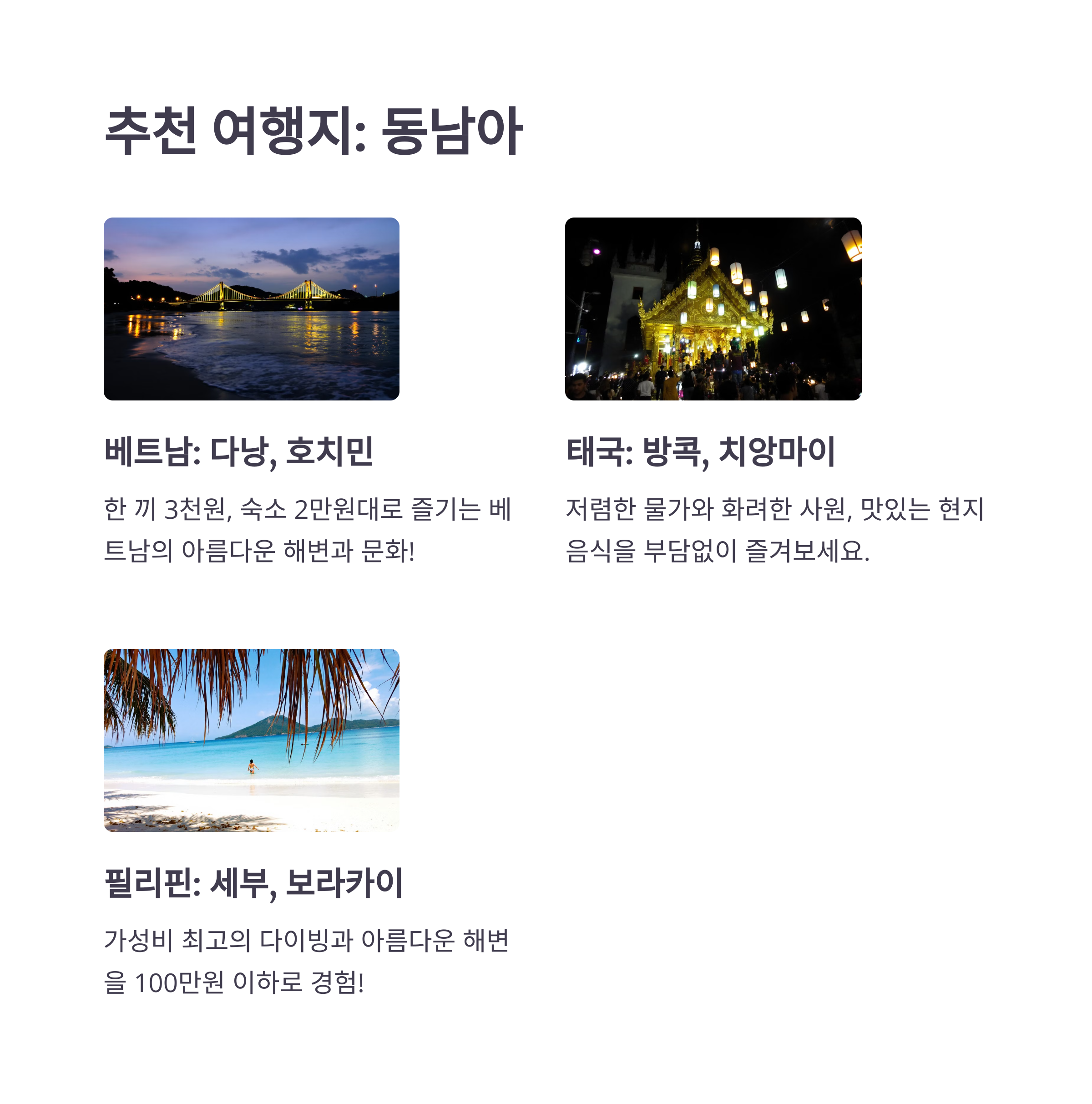 동남아시아(베트남, 태국, 필리핀), 일본(후쿠오카, 오사카) 등이 100만 원 이하의 예산으로 충분히 여행할 수 있는 지역입니다. 숙박비와 생활비가 저렴하여 저예산 여행에 적합합니다.