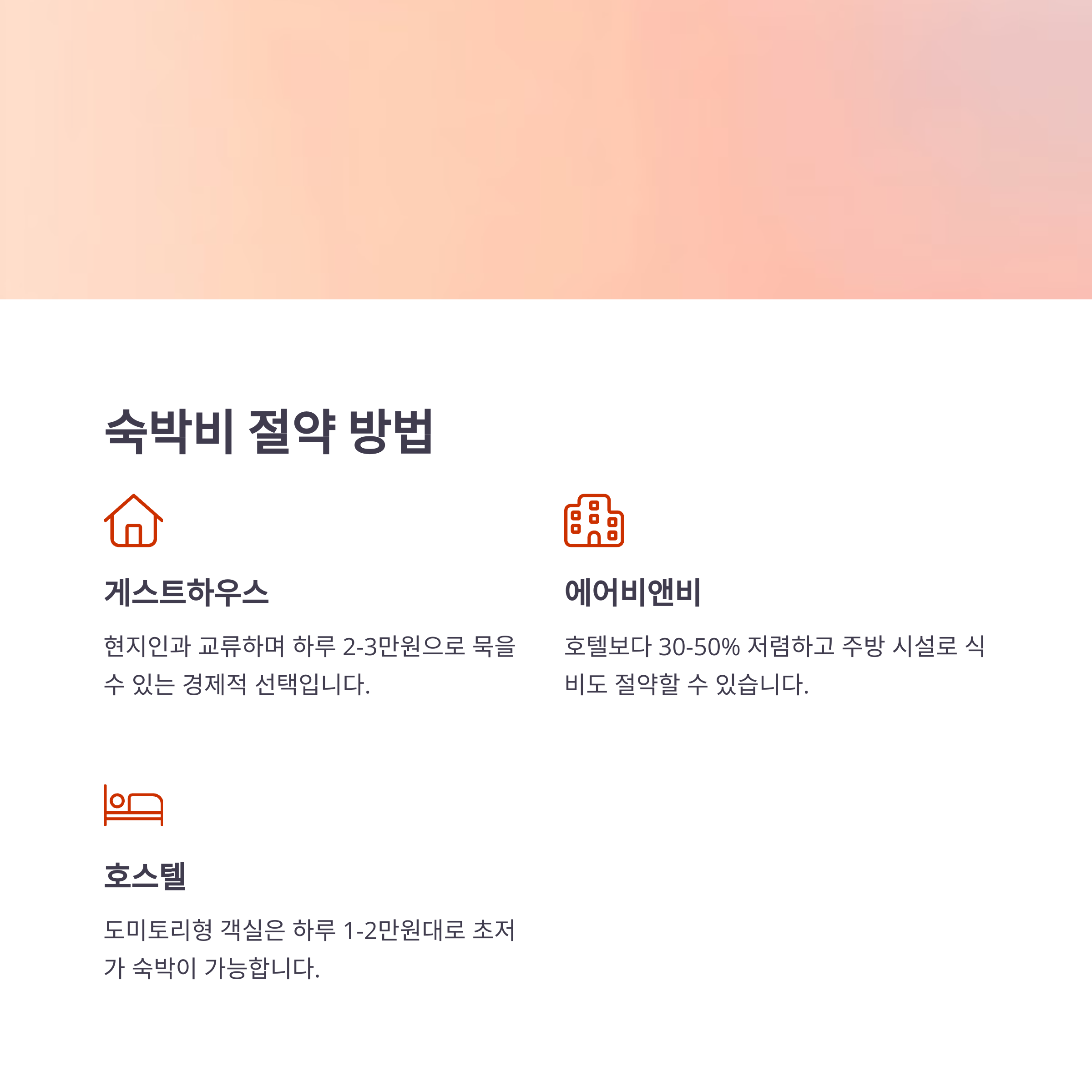 | 숙박비 절감 | 게스트하우스, 호스텔, 에어비앤비를 활용하는 방법 |