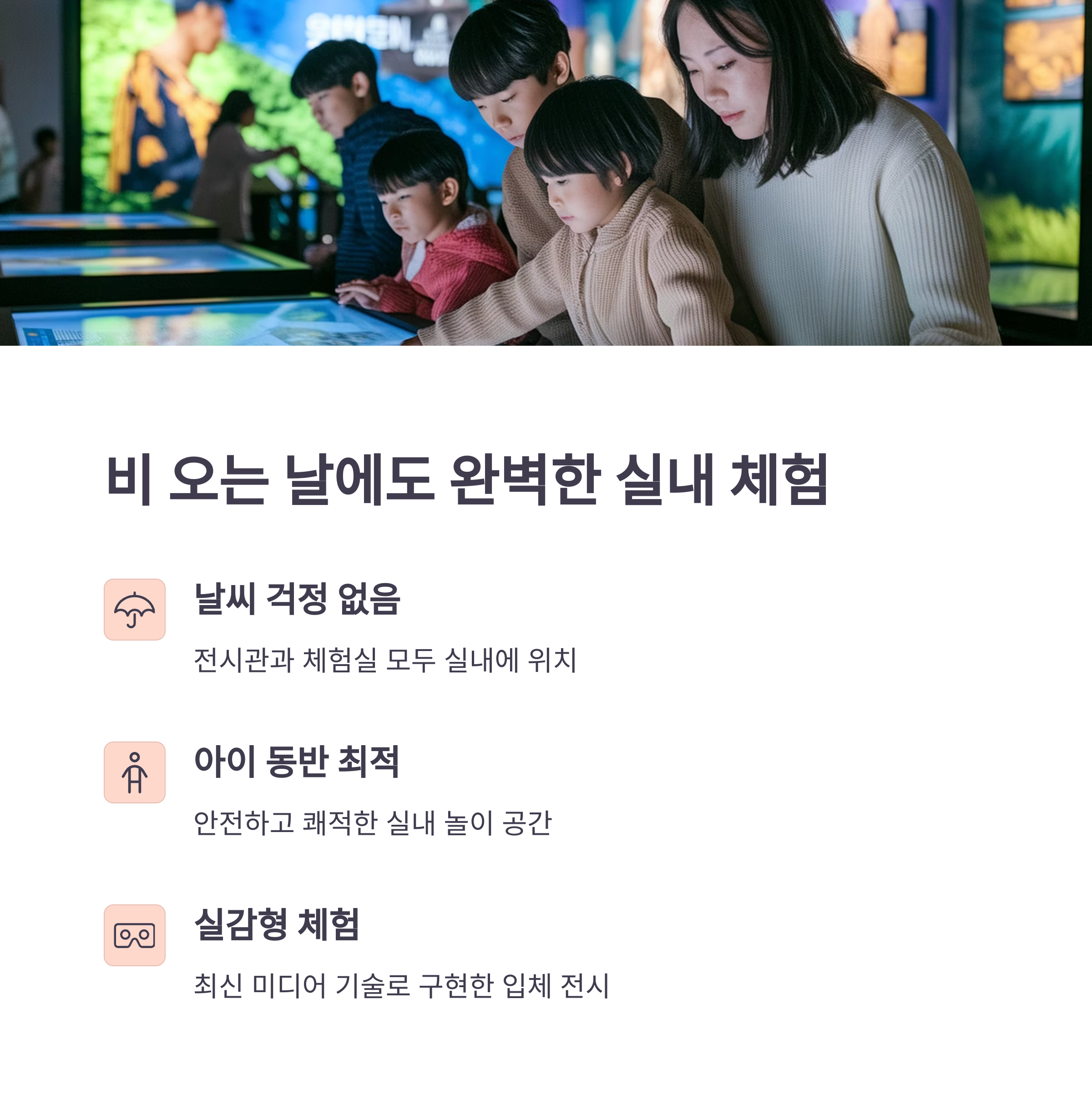 | 대표 체험 | 실내 콘텐츠 | 실외 환경 |