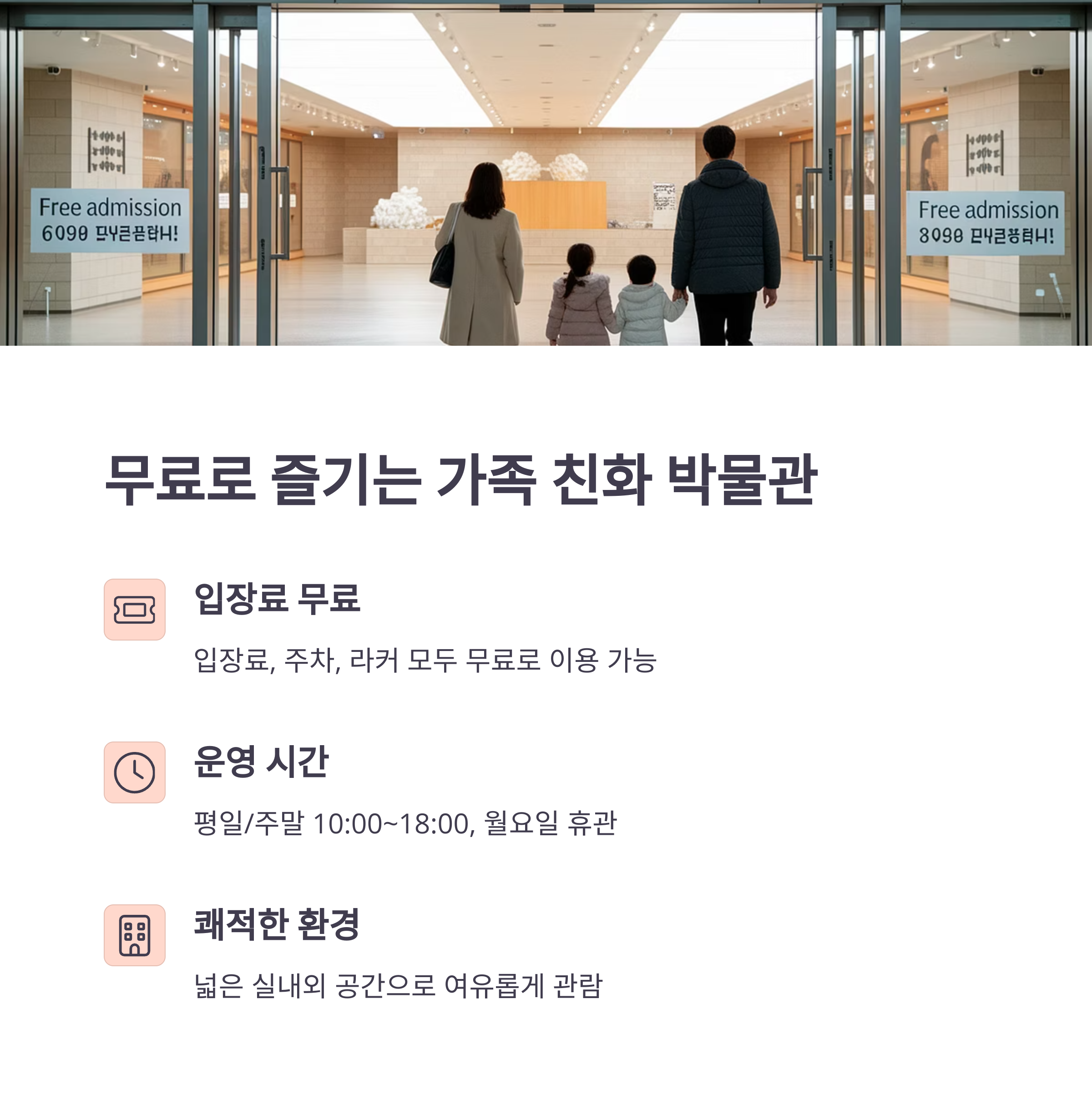 | 주먹도끼 만들기, 고고학 발굴 체험, 전곡리안의 하루 | 3D 영상, WHY 도서관, 플레이모빌 테마 전시 | 잔디광장, 산책로, 유아차 동선 확보, 무료 주차 |