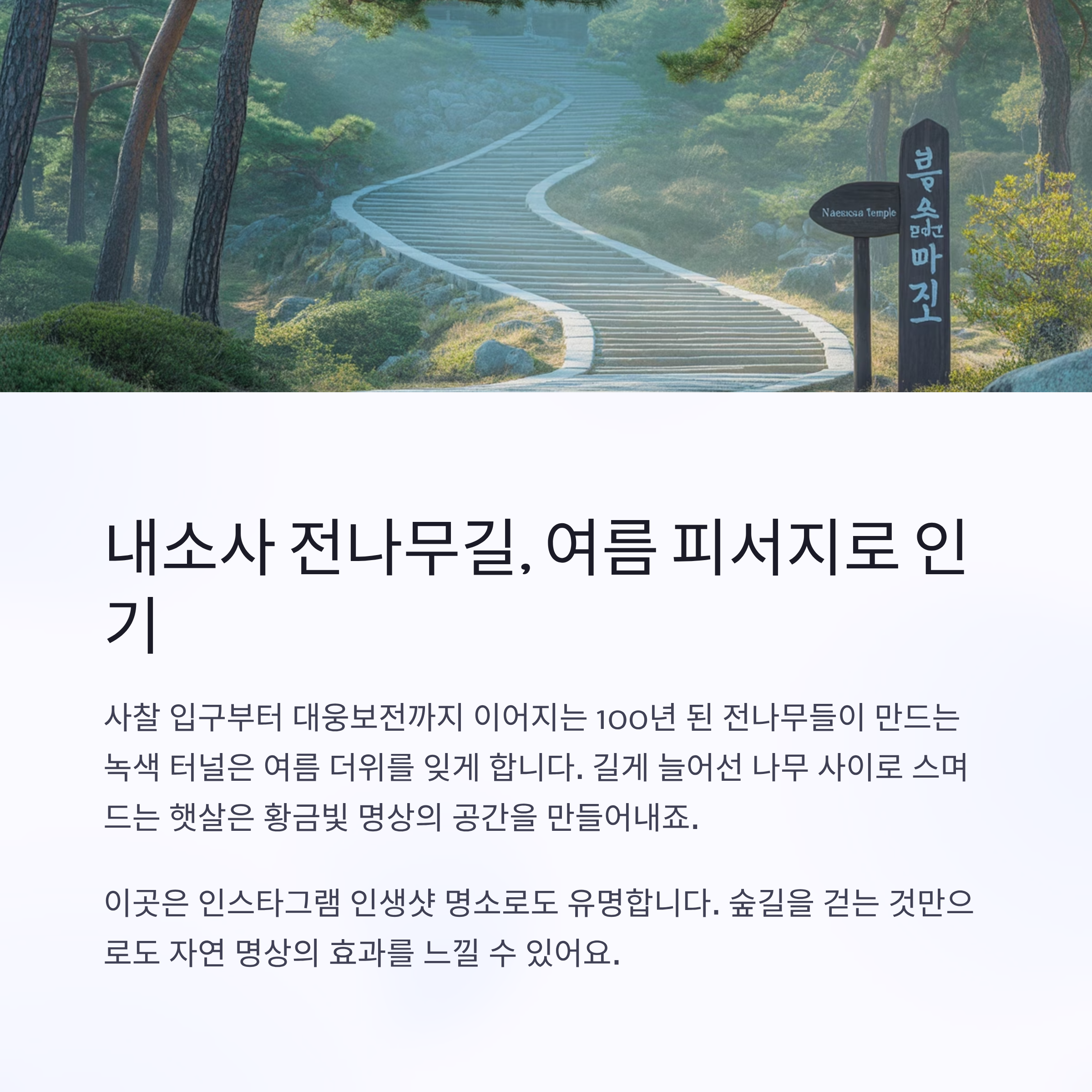 그늘 아래 걷기 좋은 여름 코스로 인기가 높습니다.